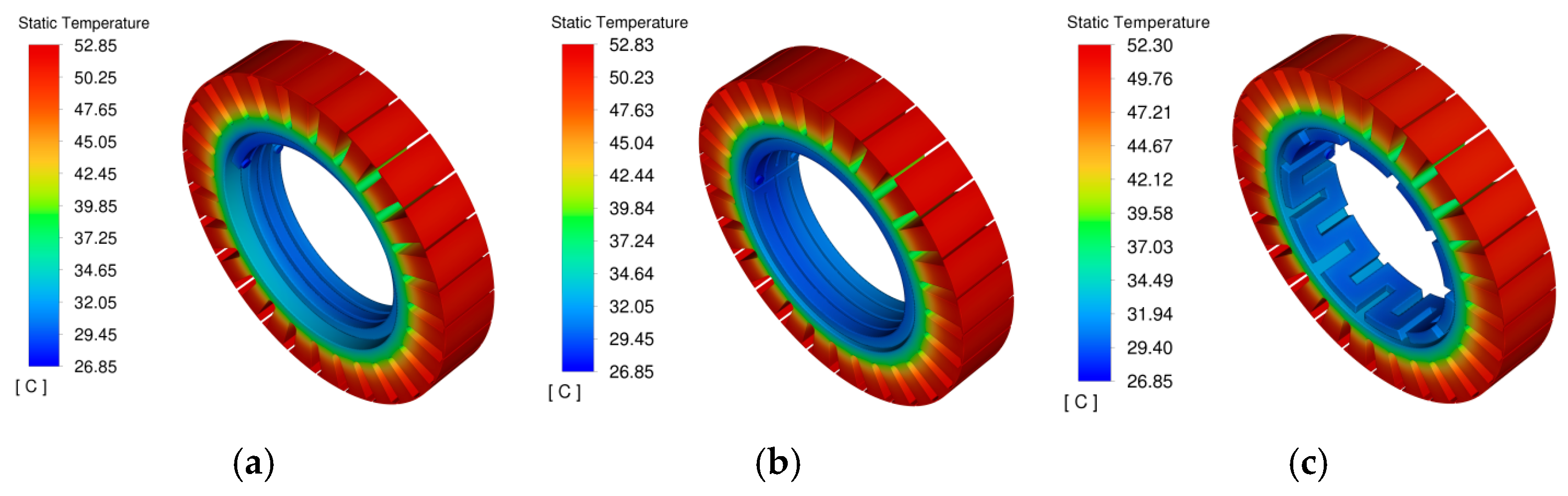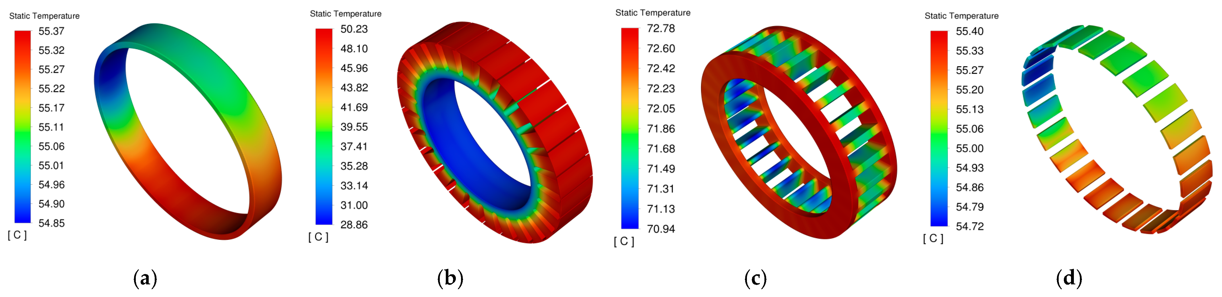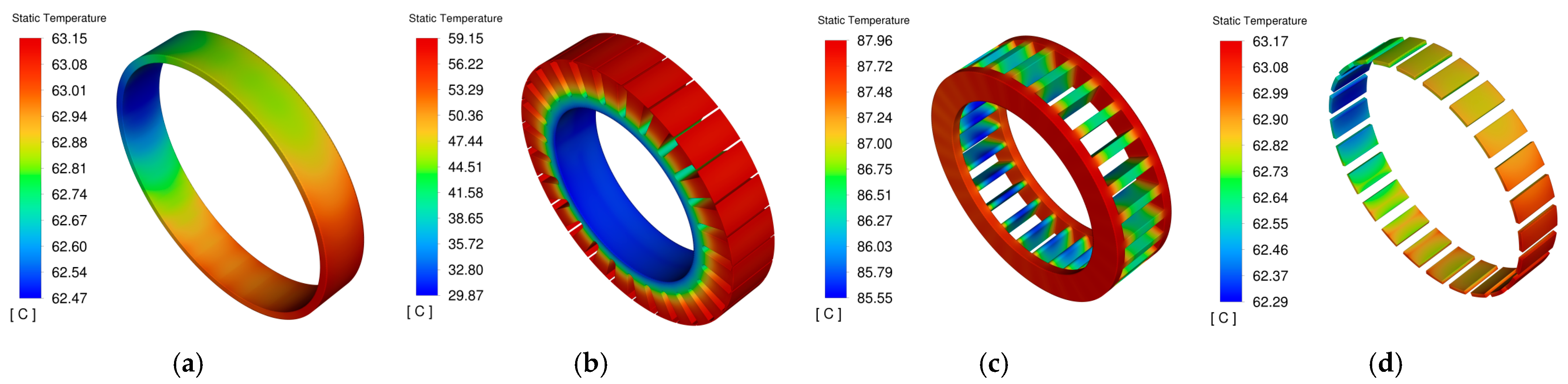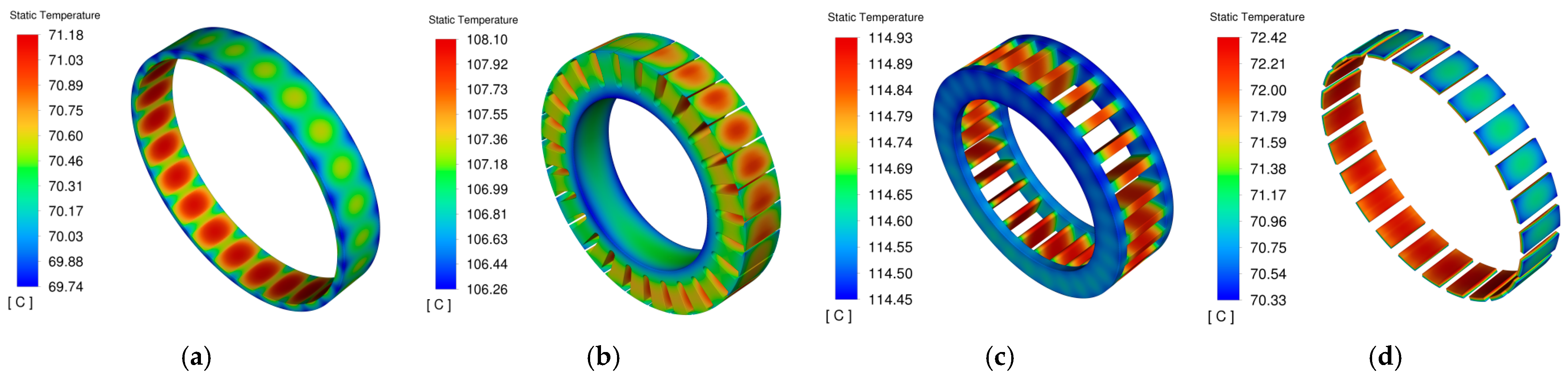Figure 8. Since the cooling channels are in direct contact with the stator, they exhibit the most effective heat dissipation for this component. Although the cooling performance varies slightly among the different channel types, the temperature near the contact area between the stator and the channels is significantly reduced. The highest temperatures in the stator are observed in the teeth and the outer wall regions.