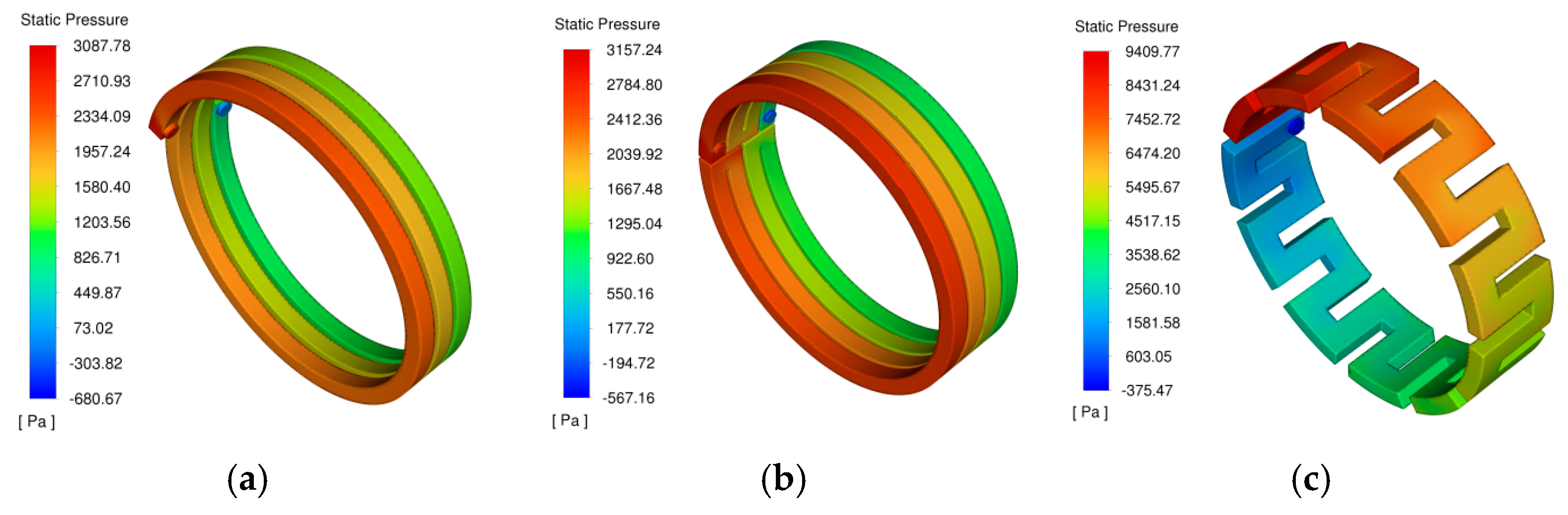 Figure 9. The maximum pressure varies significantly across channel types. The axial channel, characterized by numerous bends, exhibits the highest pressure drop of 9409.77 Pa. In contrast, the spiral channel, with no bends, demonstrates the lowest pressure drop of 3087.78 Pa. The parallel channel shows a slightly higher pressure drop of 3157.24 Pa compared to the spiral design. The “Static Pressure” values shown in the figure are defined relative to a reference pressure, typically the ambient atmospheric pressure. A positive static pressure indicates that the fluid pressure at that point is higher than the reference pressure, while a negative static pressure indicates that the fluid pressure is lower than the reference pressure.