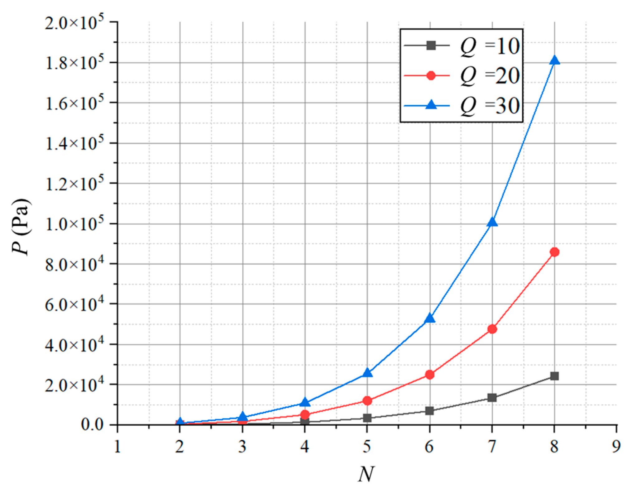 Based on Equation (16), the variation curves of the pressure generated by the coolant flowing through the parallel channels with respect to the number of channels is shown in