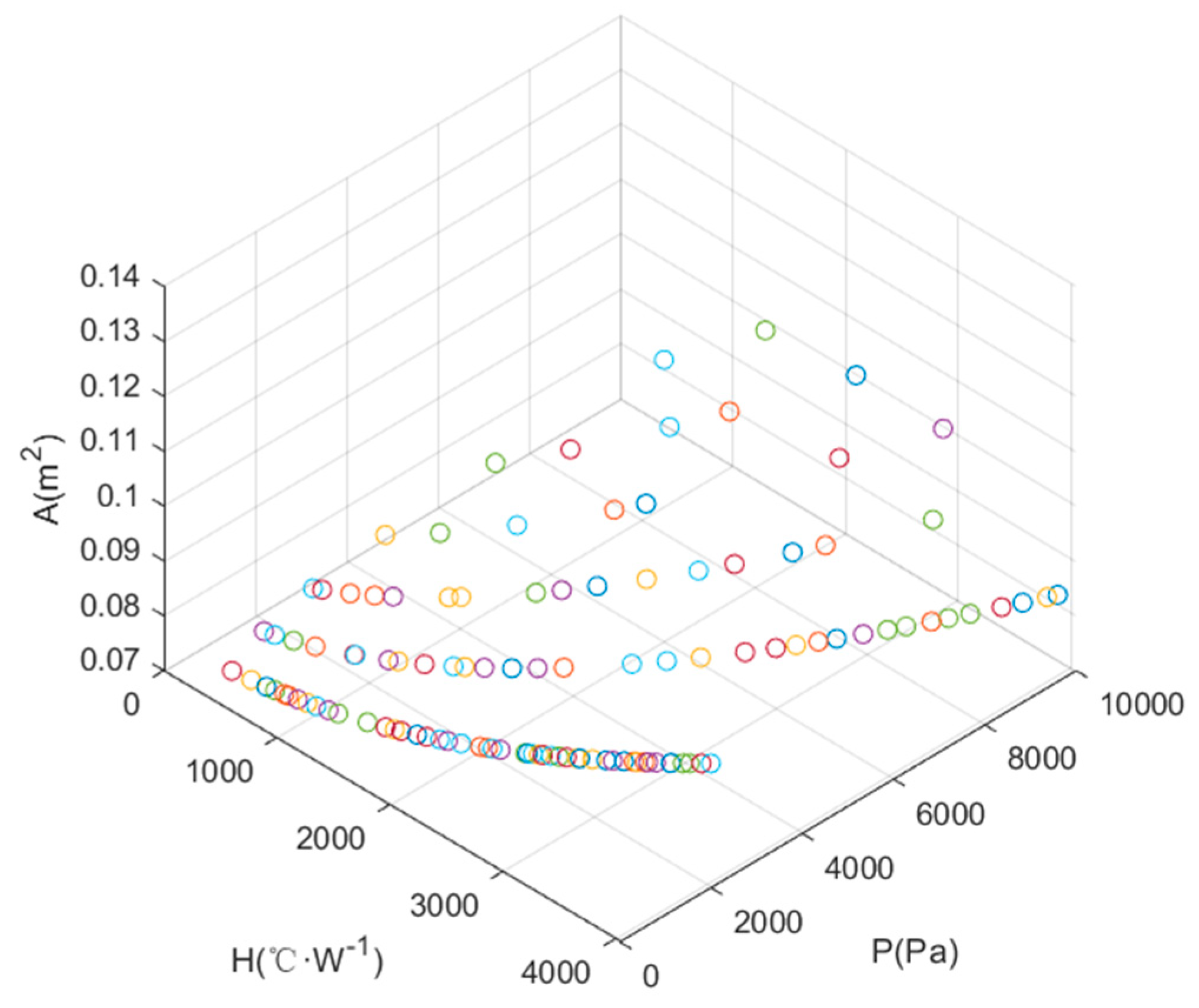 The multi-objective optimization of the aforementioned problem was solved using the NSGA-II genetic algorithm, with real-number encoding employed, a population size of 350, and 300 generations. After iterative computation, the Pareto front for heat dissipation area, convective heat transfer coefficient, and pressure drop was obtained, as shown in