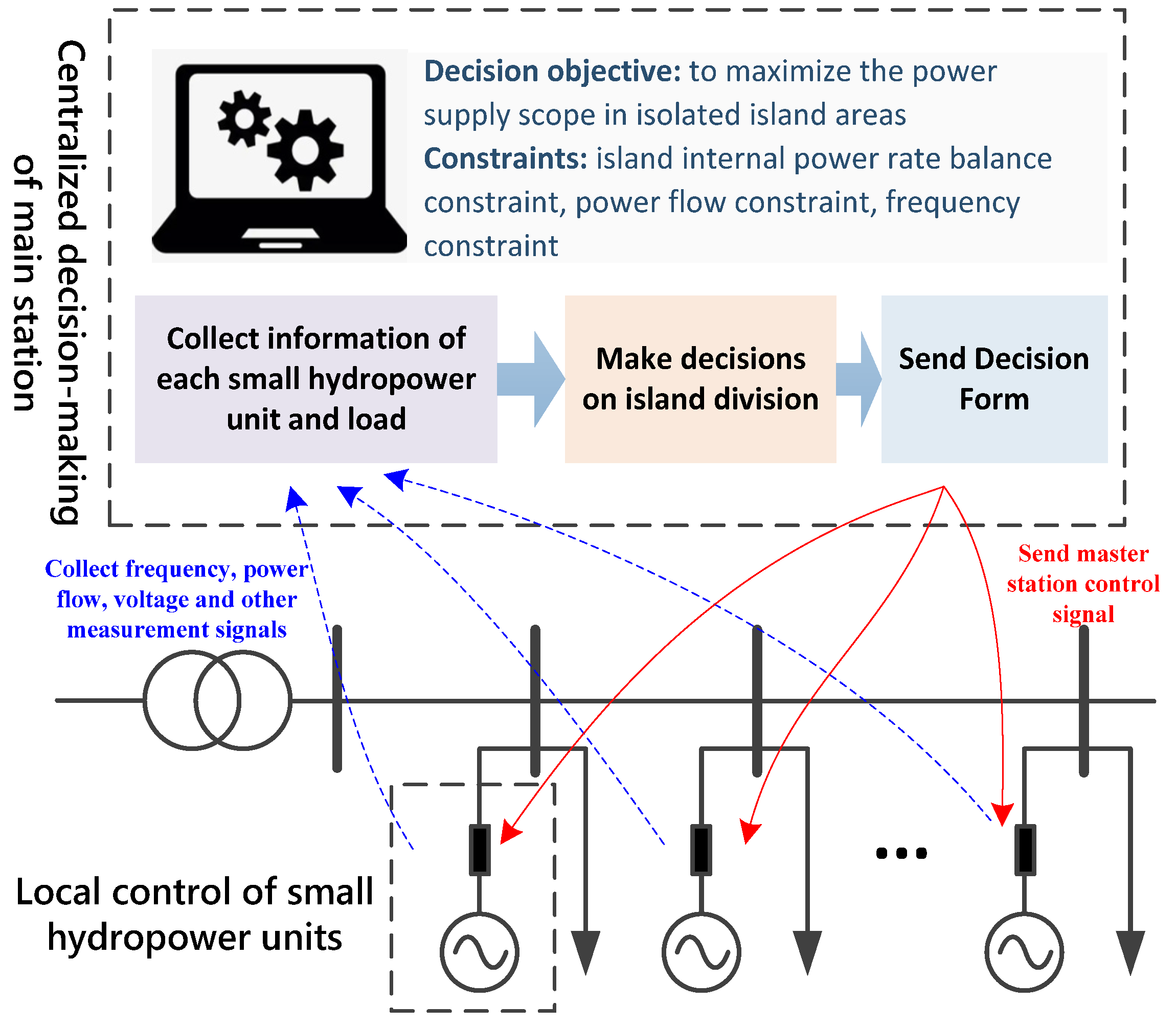 The master station collects electrical characteristics, such as frequency, power flow, and voltage, that characterize the system operation. By optimizing the decision, the decision table is sent to each small hydropower station.