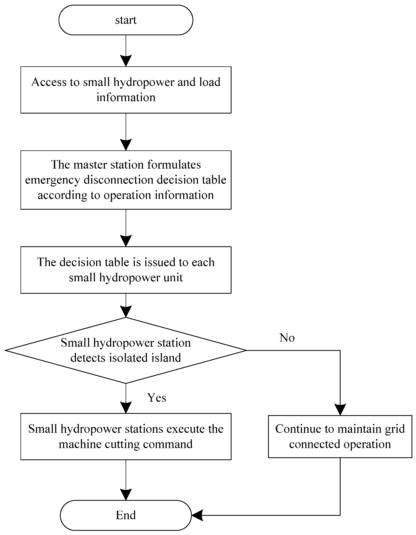 Substations issue action instructions by integrating local islanding judgment results with the emergency off-grid decision table from the master station. If local detection confirms an islanding event, the corresponding hydropower units are tripped in accordance with the commands specified in the emergency off-grid decision table; if no islanding is detected, the system continues to operate in grid-connected mode.