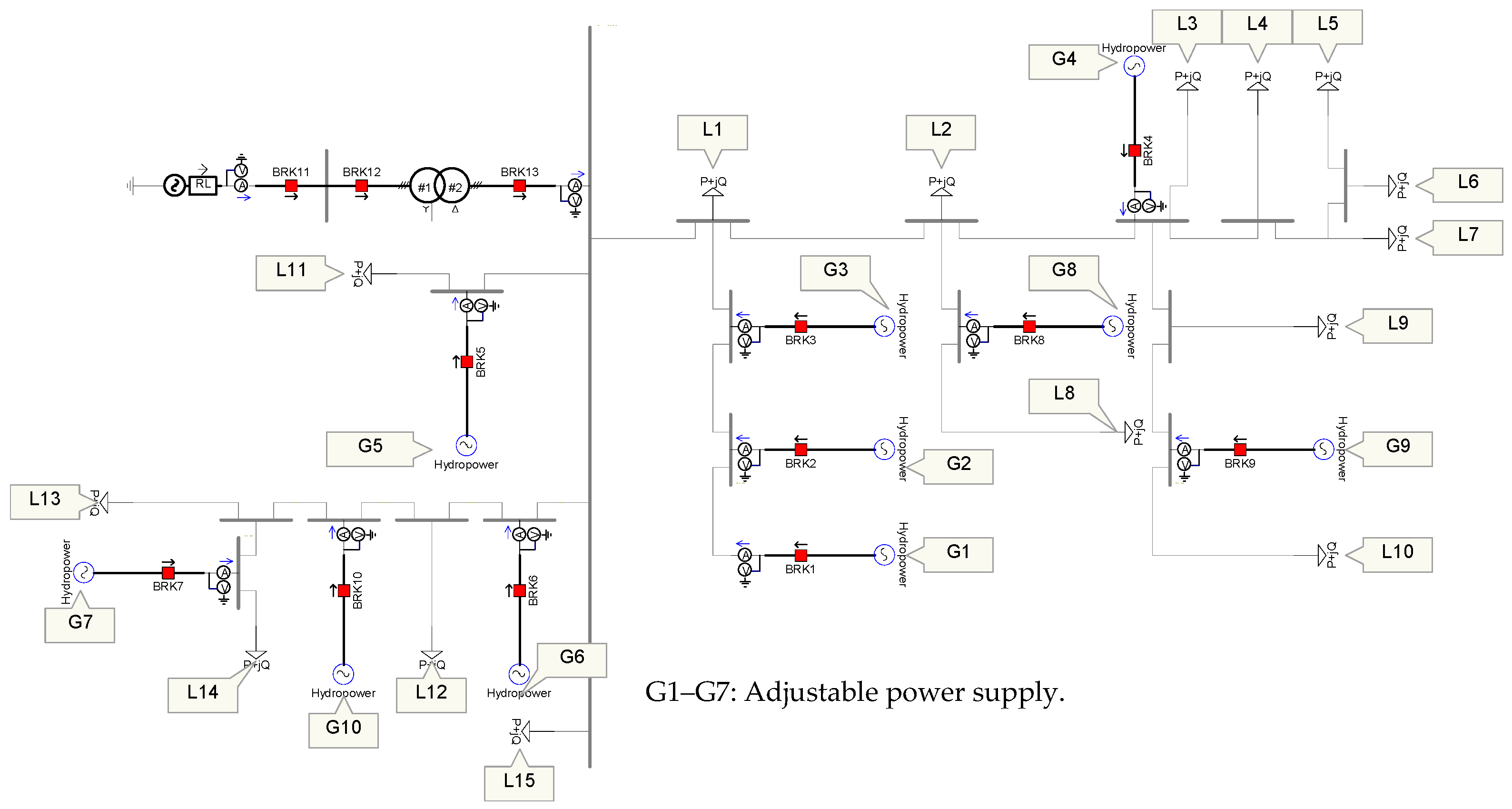 To verify the effectiveness of the proposed strategy in stabilizing system frequency during sudden islanding, an electromagnetic transient simulation model was built using the PSCAD platform. The simulation system consists of 10 hydropower units and 15 loads connected via 10 kV lines, including 7 adjustable small hydropower units (G1–G7) and 3 non-adjustable small hydropower units (G8–G10), as shown in