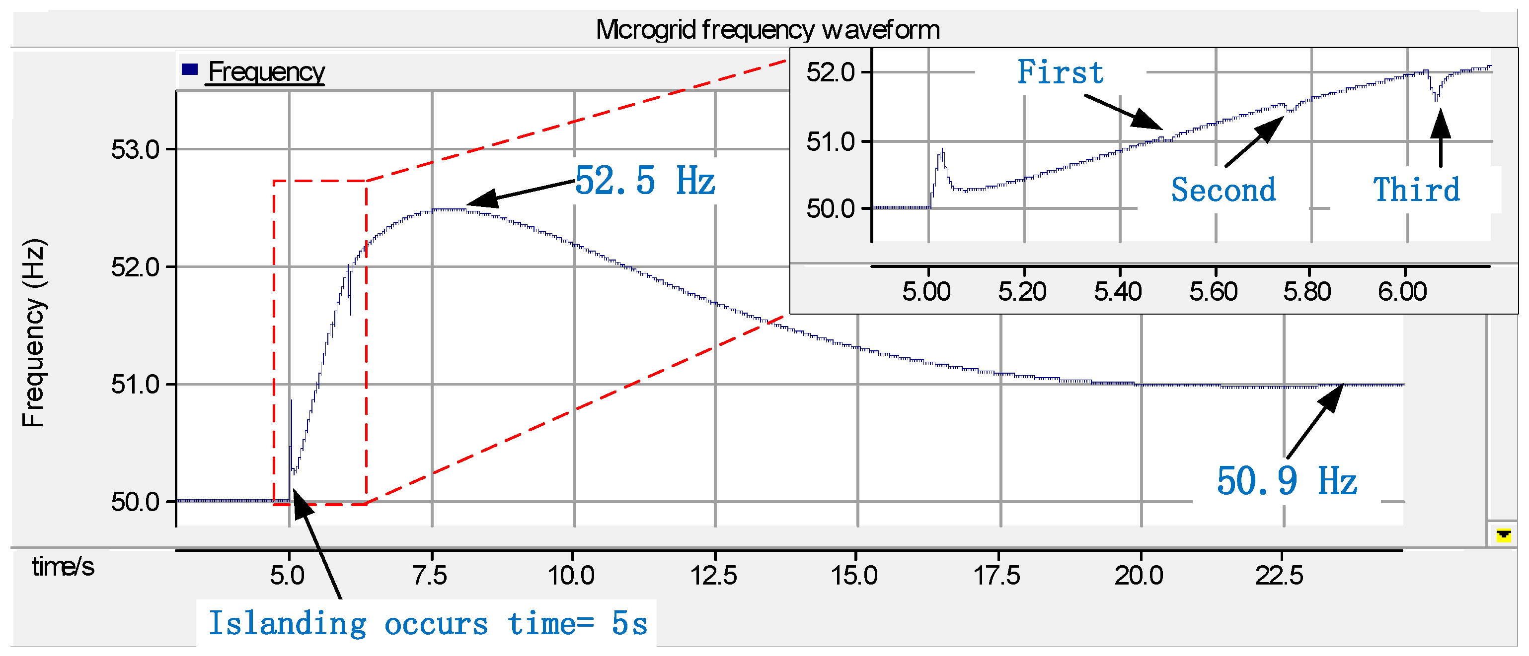 Figure 6. At 5 s after islanding, the system frequency surges to 57.62 Hz under the impact of isolation and eventually stabilizes around 54.45 Hz. This confirms that the uncontrolled scheme results in excessive frequency elevation during islanding, seriously impairing the stable and reliable operation of the power grid.