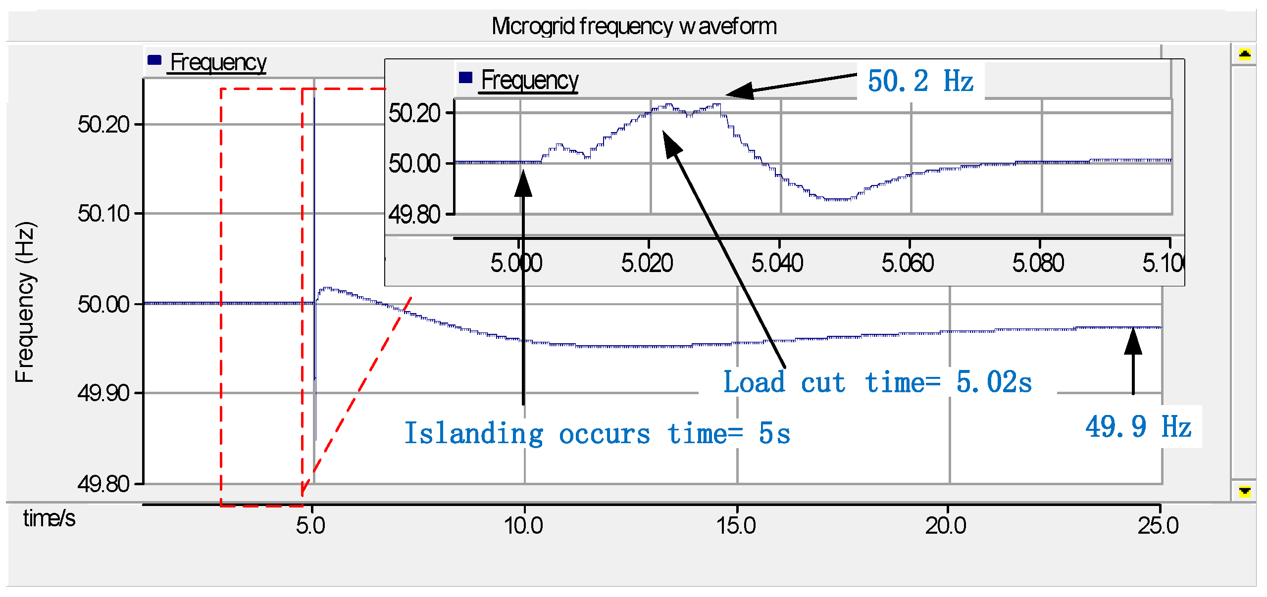 Figure 10) show that when the system enters islanding at 5 s, the microgrid confirms islanding after a 20 ms detection cycle and executes the shedding command. Frequency rises temporarily after islanding but stabilizes rapidly post-regulation. After shedding, hydropower output matches load demand, and the remaining units’ frequency regulation capability ensures stable operation. The maximum frequency during islanding reaches 50.2 Hz, dropping to a minimum of 50.115 Hz post-regulation and finally stabilizing at 49.9 Hz.