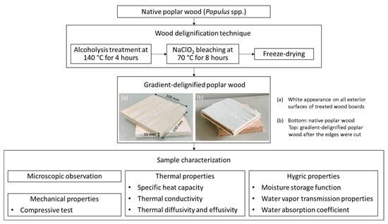 Flowchart of fabrication and characterization of gradient-delignified poplar wood made from 100 cm3 wood boards in this work.