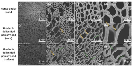 SEM images of the (a–d) native poplar wood, (e–h) core, and (i–l) surface of gradient-delignified poplar wood. Yellow arrows indicate the delignified cell wall corners, and green arrows indicate the cell wall separation.
