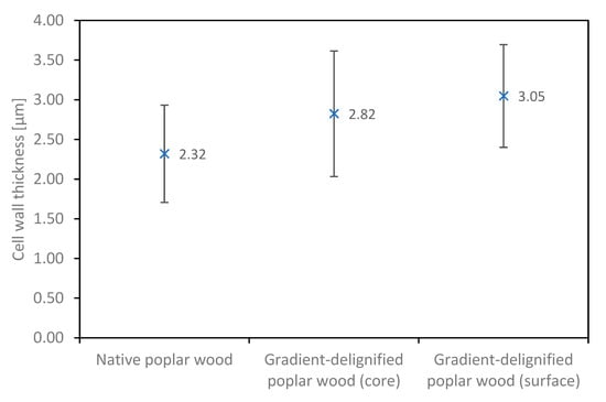 Thickness of wood cell walls measured on SEM images of native and gradient-delignified poplar wood.