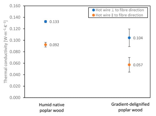 Thermal conductivities of native and gradient-delignified poplar wood measured by the hot wire method (thermal conductivity [W·m−1·K−1] ± standard deviation).