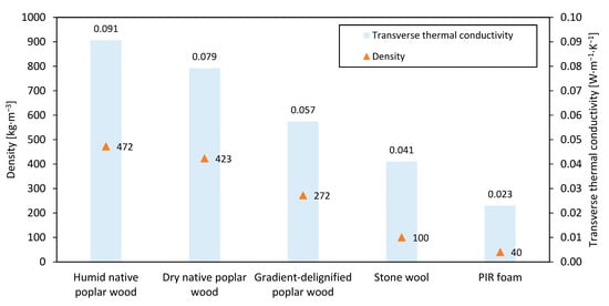 Figure 6 presents the relationship between the density and transverse thermal conductivity of different materials: humid and dry native poplar, gradient-delignified poplar, stone wool, and PIR insulation. The data measured using a heat flow meter confirmed that the moisture content significantly influences the thermal conductivity of wood. Humid native poplar wood has the highest transverse thermal conductivity (0.091 W·m−1·K−1) because water has a higher conductivity than air. Dry native poplar wood has a reduced thermal conductivity (0.079 W·m−1·K−1), highlighting the importance of moisture control for better insulating properties. The use of gradient-delignified poplar wood further reduces the transverse thermal conductivity to 0.057 W·m−1·K−1, primarily due to increased porosity, which increases from 72% to 82% in native wood. This increased porosity allows more air to be captured within the structure, improving its insulation properties. However, compared with conventional insulators such as stone wool and PIR, gradient-delignified poplar does not meet the insulating effectiveness requirements (≤0.042 W·m−1·K−1).