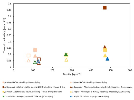Reduction in thermal conductivity of wood after delignification treatment, compared with literature data [,,,,]. Squares (//) represent longitudinal thermal conductivity, triangles (⟂) represent transverse thermal conductivity. Filled markers indicate natural wood before treatment, while empty markers indicate values after treatment. Legends specify wood species, treatment method, and drying method.