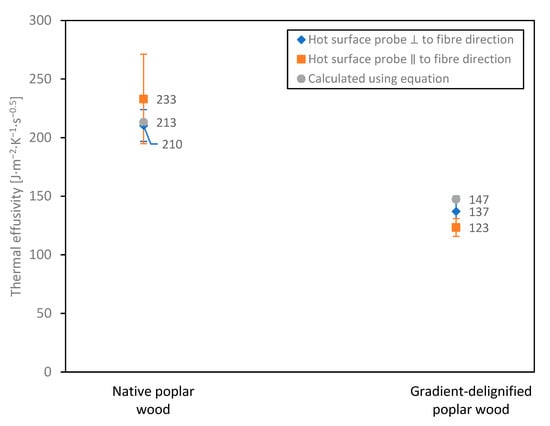 Thermal effusivity measured by a hot surface probe of native and gradient-delignified poplar wood (thermal effusivity [J·m−2·K−1·s−0.5] ± standard deviation).