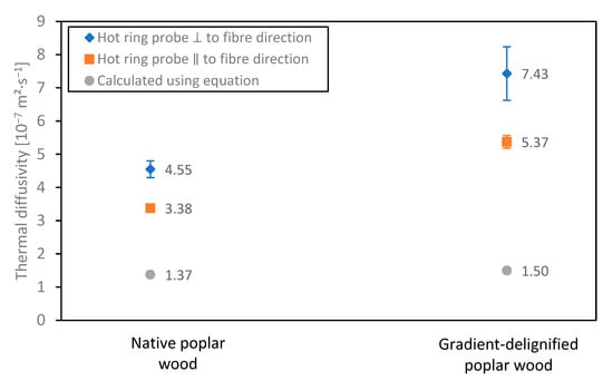 Thermal diffusivity measured by a hot ring probe of native and gradient-delignified poplar wood (thermal diffusivity [10−7 m2·s−1] ± standard deviation).