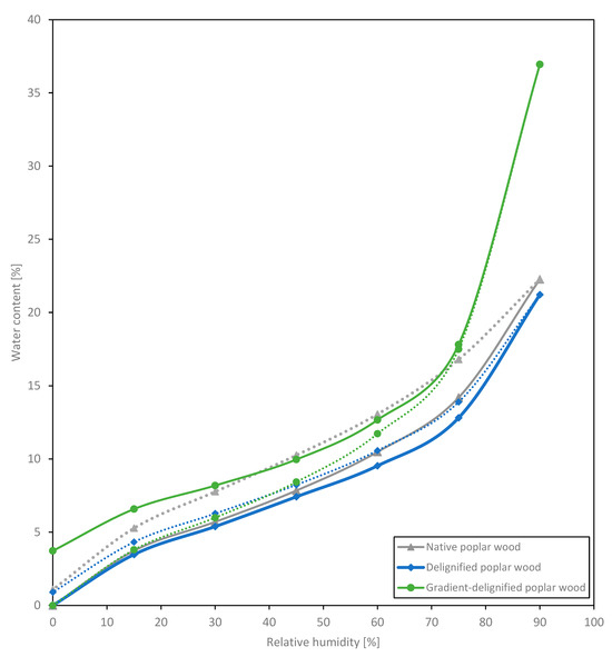 The moisture storage function is important for building materials, as it helps regulate indoor humidity levels to maintain a healthy indoor environment. Additionally, it allows the understanding of how materials behave in moist surroundings, which is useful for predicting dimensional variations due to relative humidity changes. These dimensional changes are linked to fluctuations in the water content of the material, making the study of moisture storage functions essential for the performance and durability of wood-based products []. A wood will adsorb surrounding condensable vapors until its equilibrium moisture content is reached. The sorption isotherms for native poplar wood, delignified poplar wood, and gradient-delignified poplar wood are shown in Figure 10.