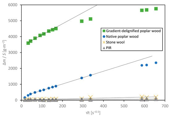 where Δm [kg] is the change in mass, S [m2] is the immersed surface area, and t [s] is the time. The slope of the plot of Δm/S against √t was used to determine the coefficient Aw.