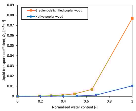 The water absorption coefficient (Aw) was then used to determine the liquid transport coefficient, Dw (m2·s−1), with the moisture storage function. The complete saturation of samples at 100% RH for the definition of free water content was difficult to measure precisely because of its exponential increase. The values used in the calculation were expected to be underestimated. Figure 13 illustrates that gradient-delignified poplar wood had a higher liquid transport coefficient than native poplar wood did, especially at higher normalized water contents. This indicated that the material had become more porous and hydrophilic, leading to faster water transport through the gradient-delignified wood as it became saturated, even in the fibers’ transverse direction.