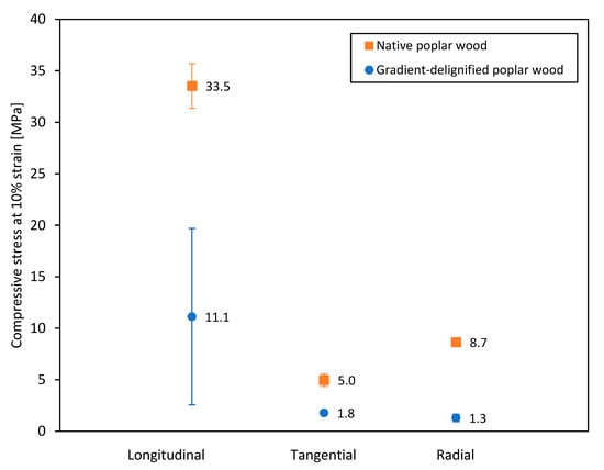 The key results from the stress–strain (σ-ε) curves were summarized in terms of compressive stress at 10% strain (Figure 14) and compressive strength (Figure 15). The compressive strength values could only be obtained in the longitudinal direction due to the occurrence of fracture stress. In contrast, the radial and tangential directions exhibited densification behavior where lumens were compressed and the fibers were densified until a maximum strain was reached, transmitting the load to the testing machine without fracturing. This densification process has the potential to make stronger materials. Densification without rupture in the transverse direction might improve the stress-bearing capacity in the longitudinal direction due to the closure of lumens and increased friction between the cell walls and cellulose fibrils.