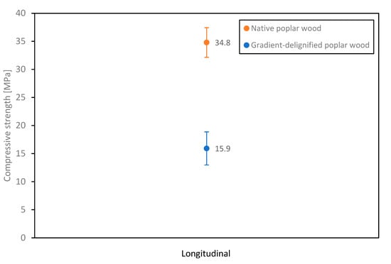 Compressive strength of native and gradient-delignified poplar wood in the longitudinal direction (strength [MPa] ± standard deviation).