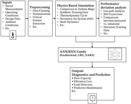 ANN-augmented thermodynamic models have demonstrated robustness to noisy sensor data and adaptability under off-design operating conditions [17,50,51,52]. They rely largely on synthetic datasets generated from thermodynamic simulations, preserve interpretability through their grounding in cycle physics, and focus on component-level health indicators. However, these models often require domain adaptation or retraining when applied to real engine environments, due to mismatches in operating conditions, sensor noise, and unmodeled degradation effects [4,13]. Hybrid diagnostic frameworks have been developed that integrate ANNs with thermodynamic cycle simulations to estimate component degradation levels such as compressor flow capacity loss and turbine efficiency reduction, improving early fault detection using simulated deterioration data [42,43,44,45]. Distributed ANN-based gas path analysis (GPA) frameworks employing classification, auto-associative, and approximation networks have also been proposed to isolate and quantify multiple simultaneous faults, demonstrating robust identification, localization, and severity estimation under nonlinear and noisy conditions, and outperforming conventional GPA approaches [46,47,48,53].
