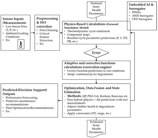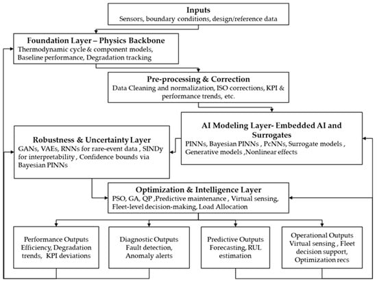 Thermodynamic cycle models and component conservation equations provide the physically consistent backbone for these frameworks, ensuring accurate estimation of critical parameters such as turbine inlet temperature (TIT) and specific fuel consumption (SFC). Embedded AI modules enhance computational speed, improve robustness to sensor uncertainty, and capture nonlinear degradation effects that classical physics models alone cannot fully represent.