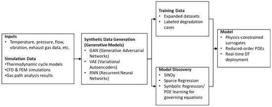 Generative and model discovery approaches address challenges of data scarcity, interpretability, and modeling of complex multicomponent interactions in gas turbine systems. These methods are particularly valuable when operational fault data are rare, extreme events are underrepresented, or physics-based models are incomplete or computationally expensive for real-time deployment. Generative models such as generative adversarial networks (GANs), variational autoencoders (VAEs), and recurrent neural networks (RNNs) have been applied to create synthetic operating scenarios, expanding limited datasets and improving robustness under rare or transient conditions [8,39,40]. Model discovery techniques, including sparse identification of nonlinear dynamics (SINDy) and its PySINDy implementation, extract simplified governing equations directly from data to support reduced-order modeling and interpretable control [24,30,69].