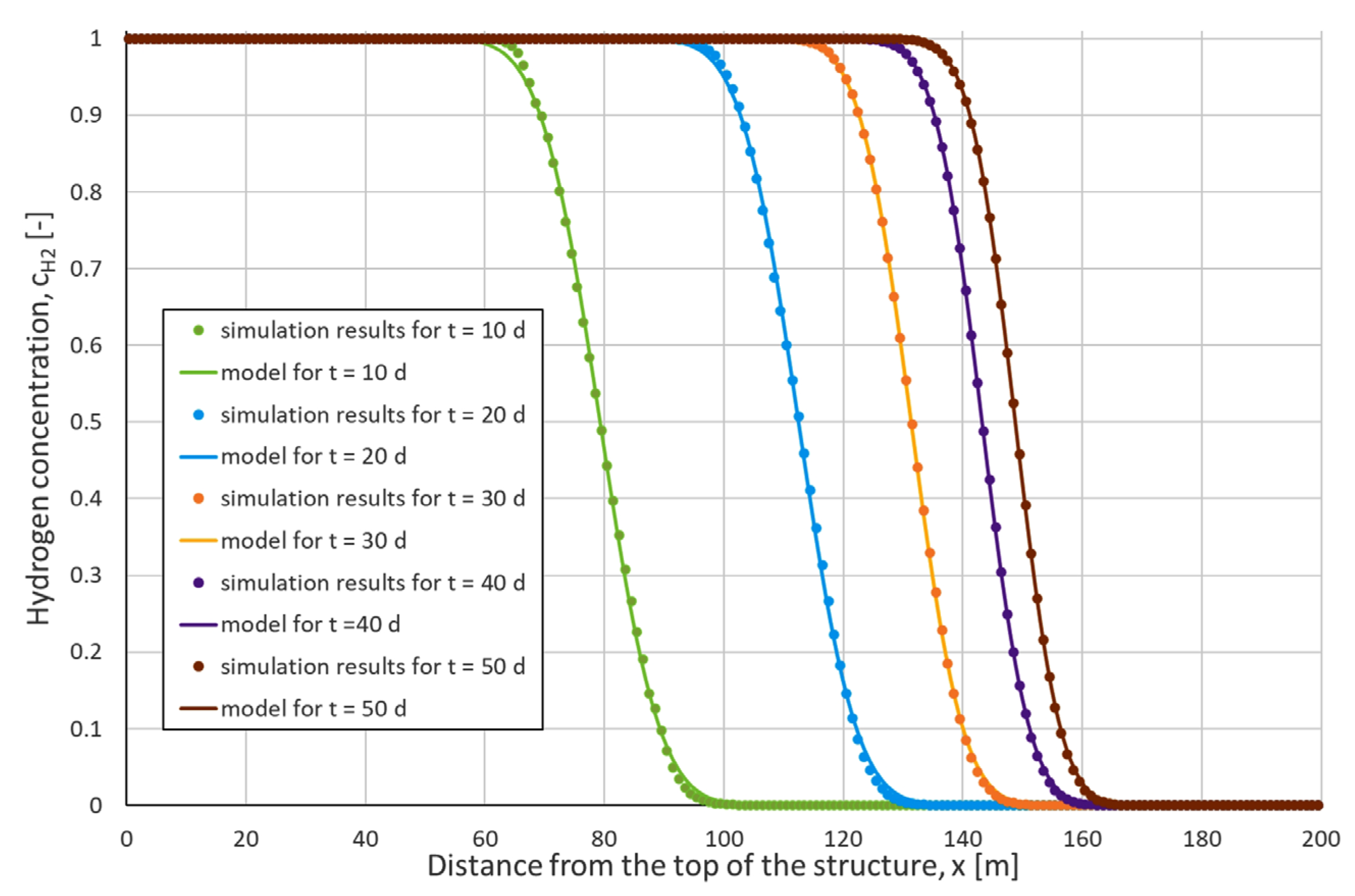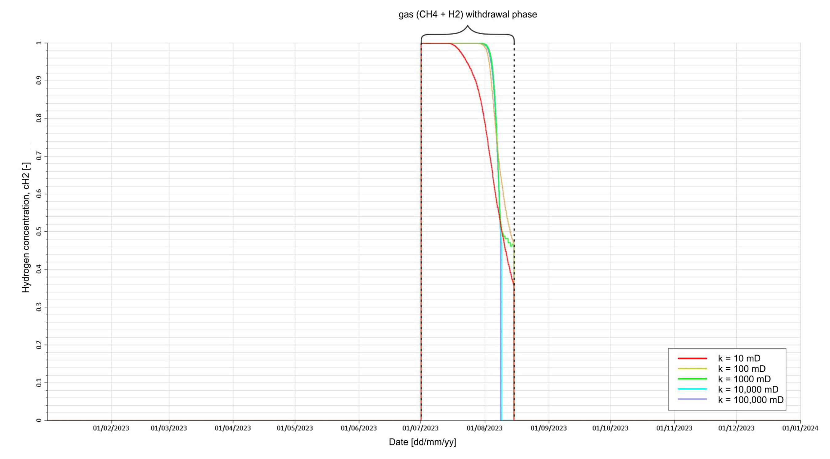 - Physical dispersion modelled as numerical dispersion is identified as the primary driver of mixing during the operation of UHS. This phenomenon has a significant influence on the composition of withdrawn gas.