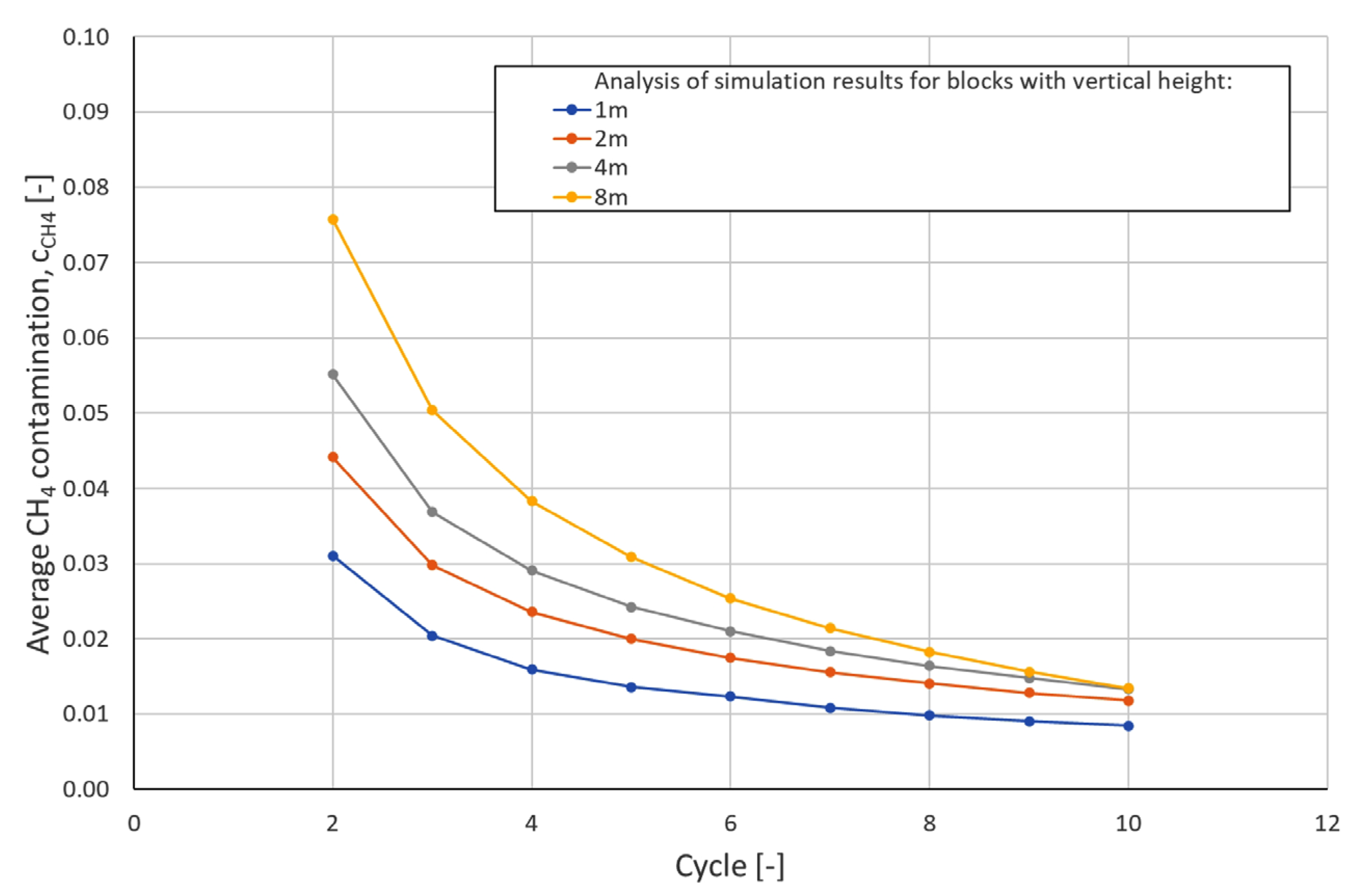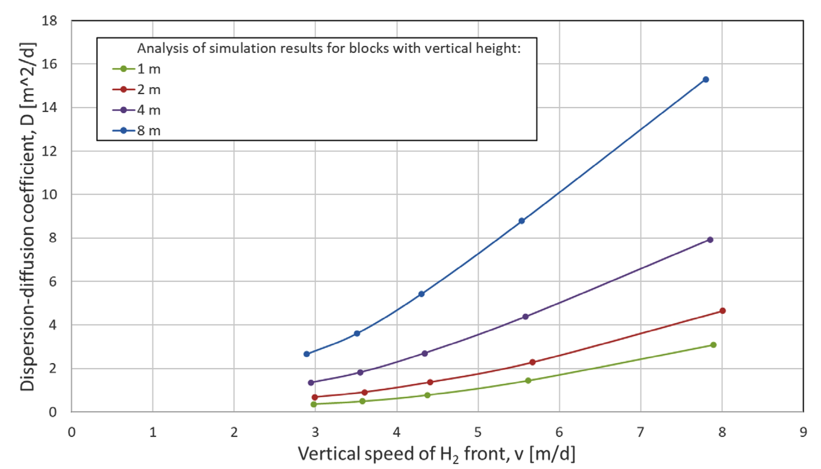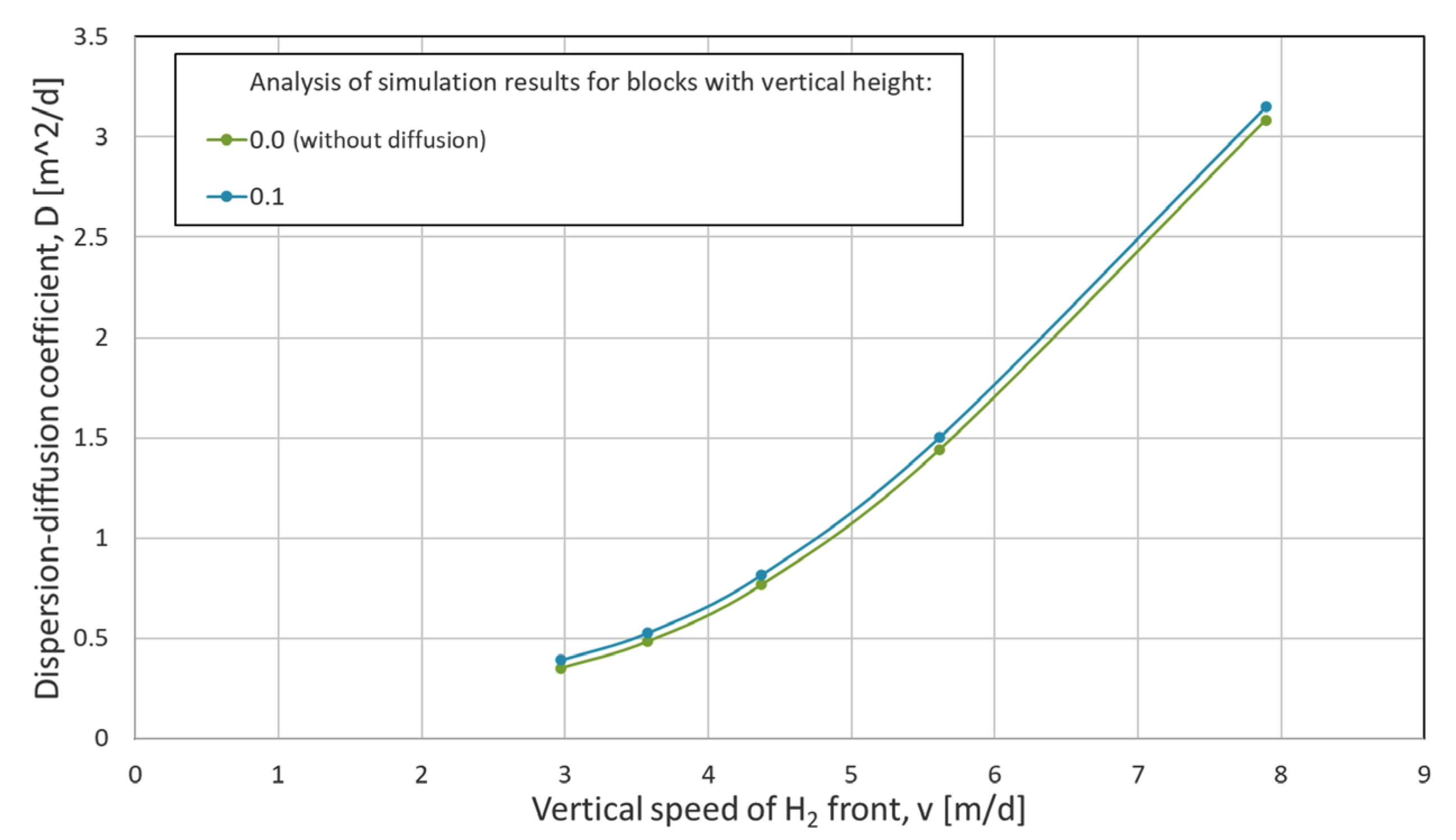 - A research gap has been identified: to the authors’ best knowledge, no prior publication has systematically quantified the combined effects of dispersion and diffusion on the modelling of UHS operation or their impact on the composition of withdrawn gas during cyclic operations. This work provides a methodological framework for these assessments and practical guidance for forecasting the composition of withdrawn gas, which is crucial for the gas calorific value.