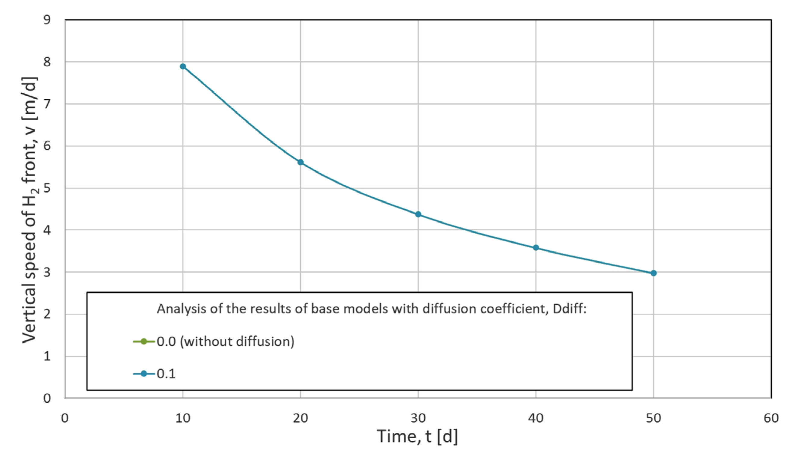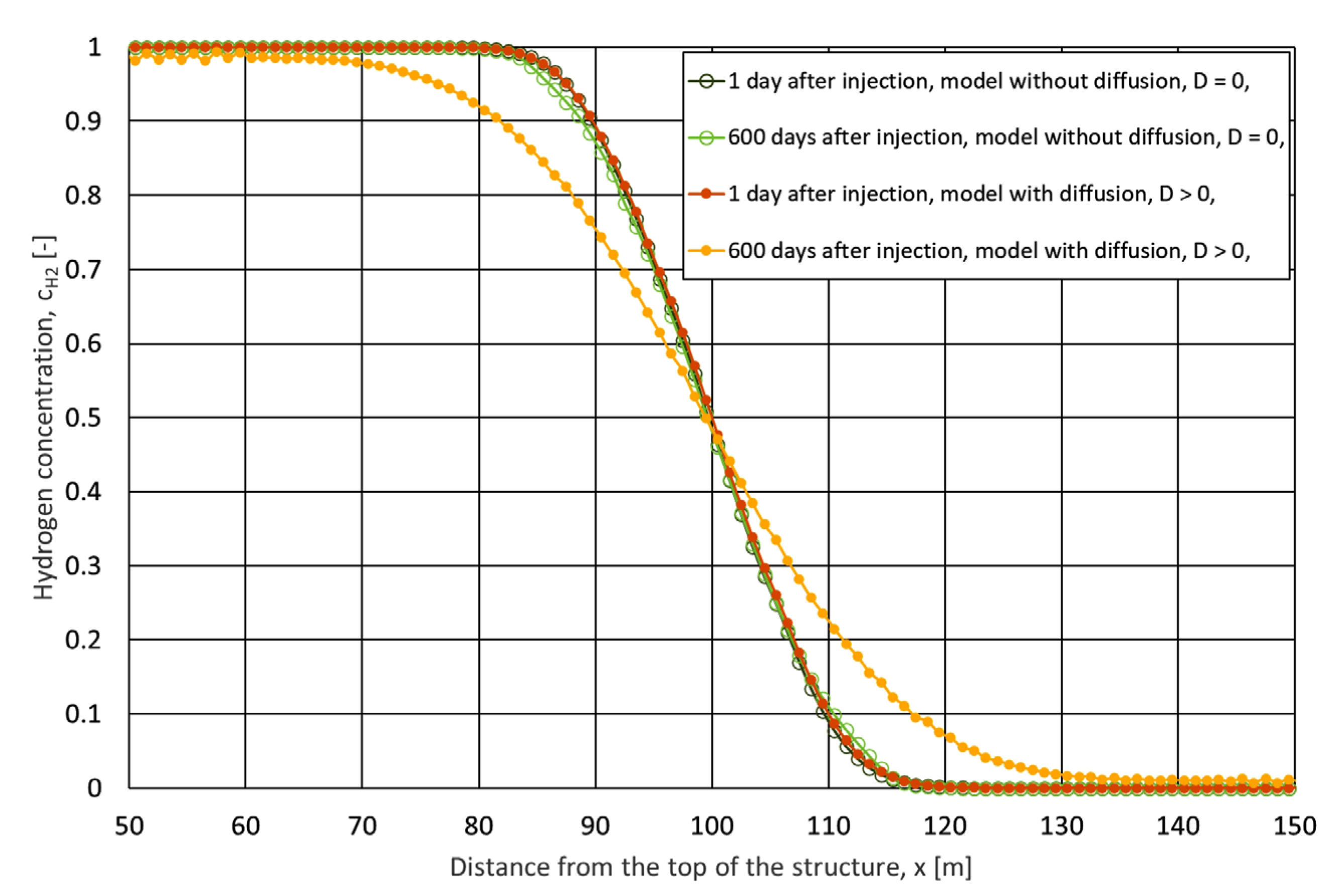 - Molecular diffusion does not have a significant impact on the modelling of flows caused by the pressure gradient in the cavern, but it may be important in a situation where there are no such flows, i.e., during the so-called stand-ups.