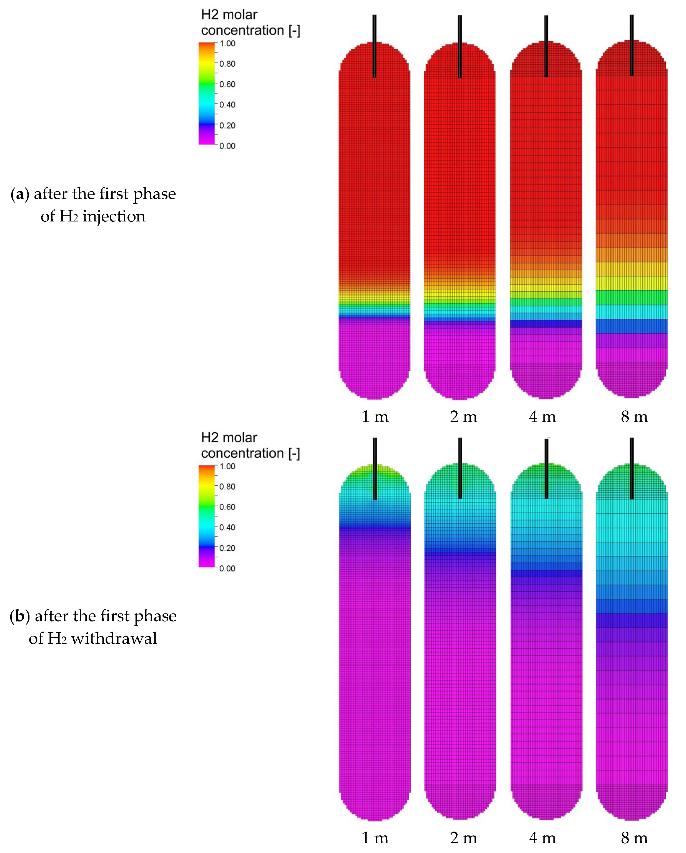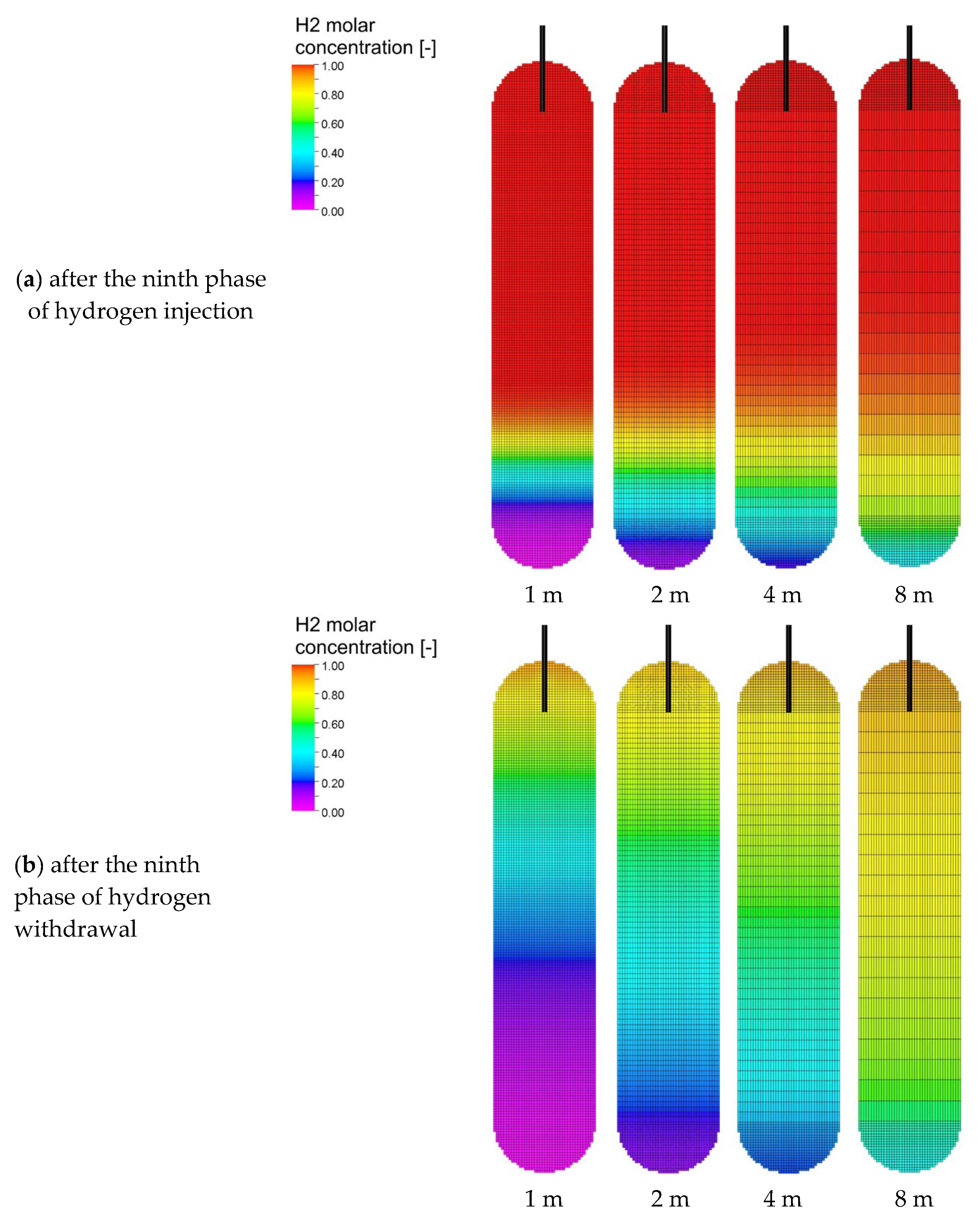 - Feldmann, F.; Hagemann, B.; Ganzer, L.; Panfilov, M. Numerical Simulation of Hydrodynamic and Gas Mixing Processes in Underground Hydrogen Storages. Environ. Earth Sci. 2016, 75, 1165. [Google Scholar] [CrossRef]