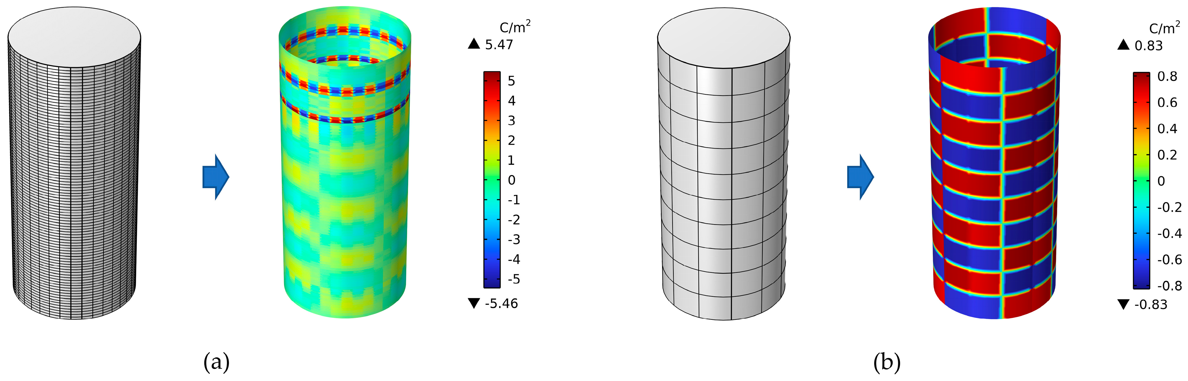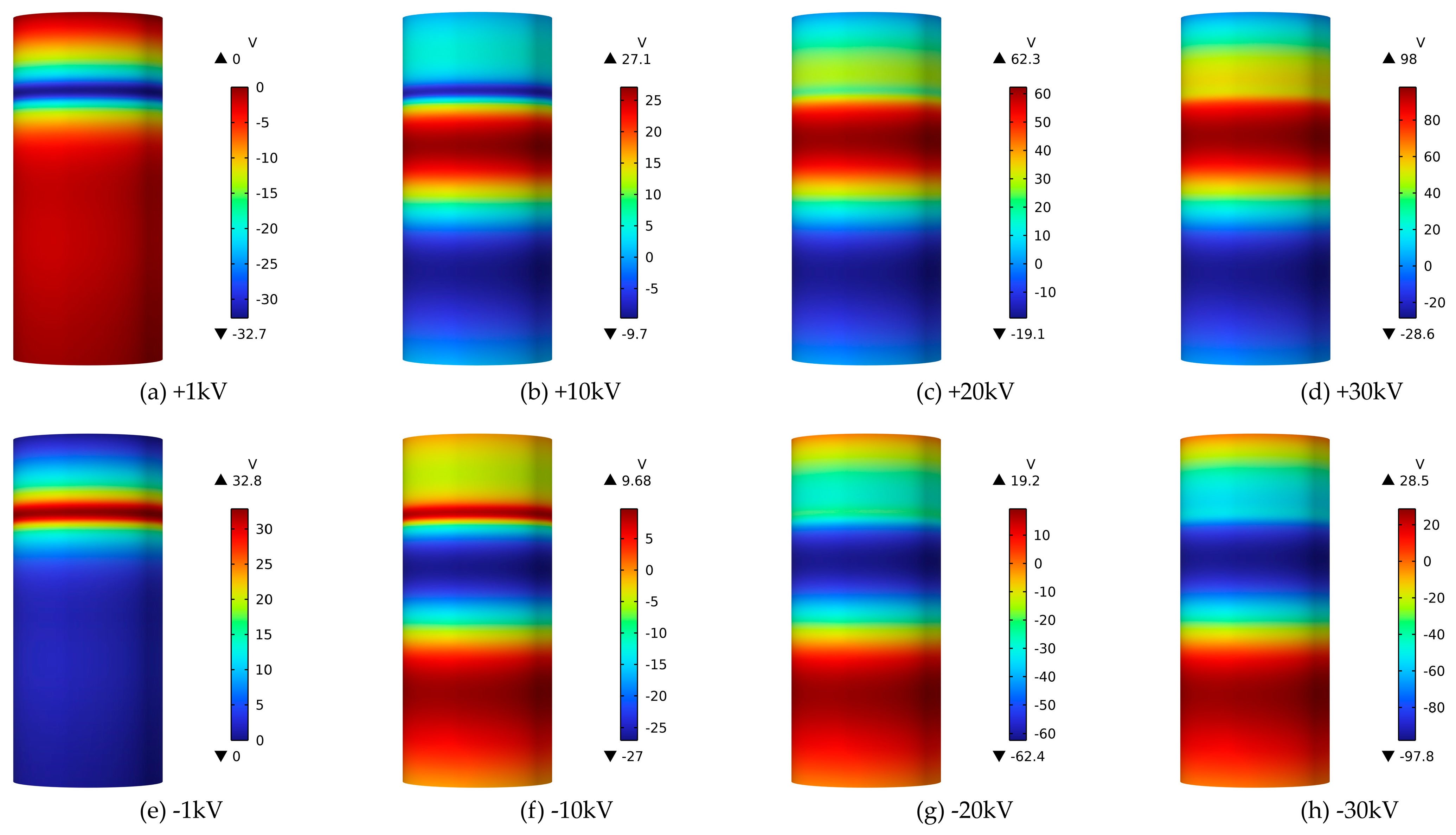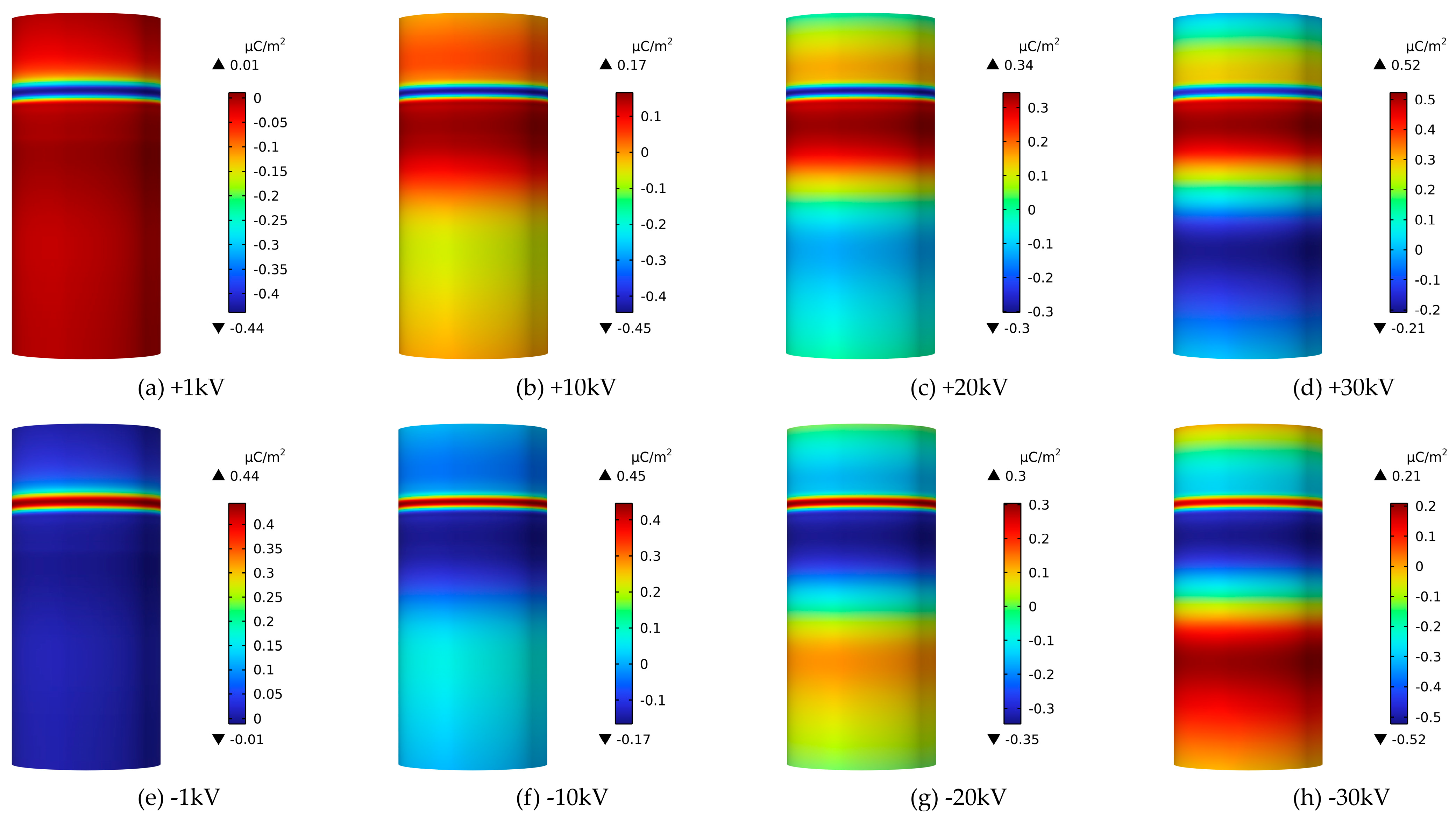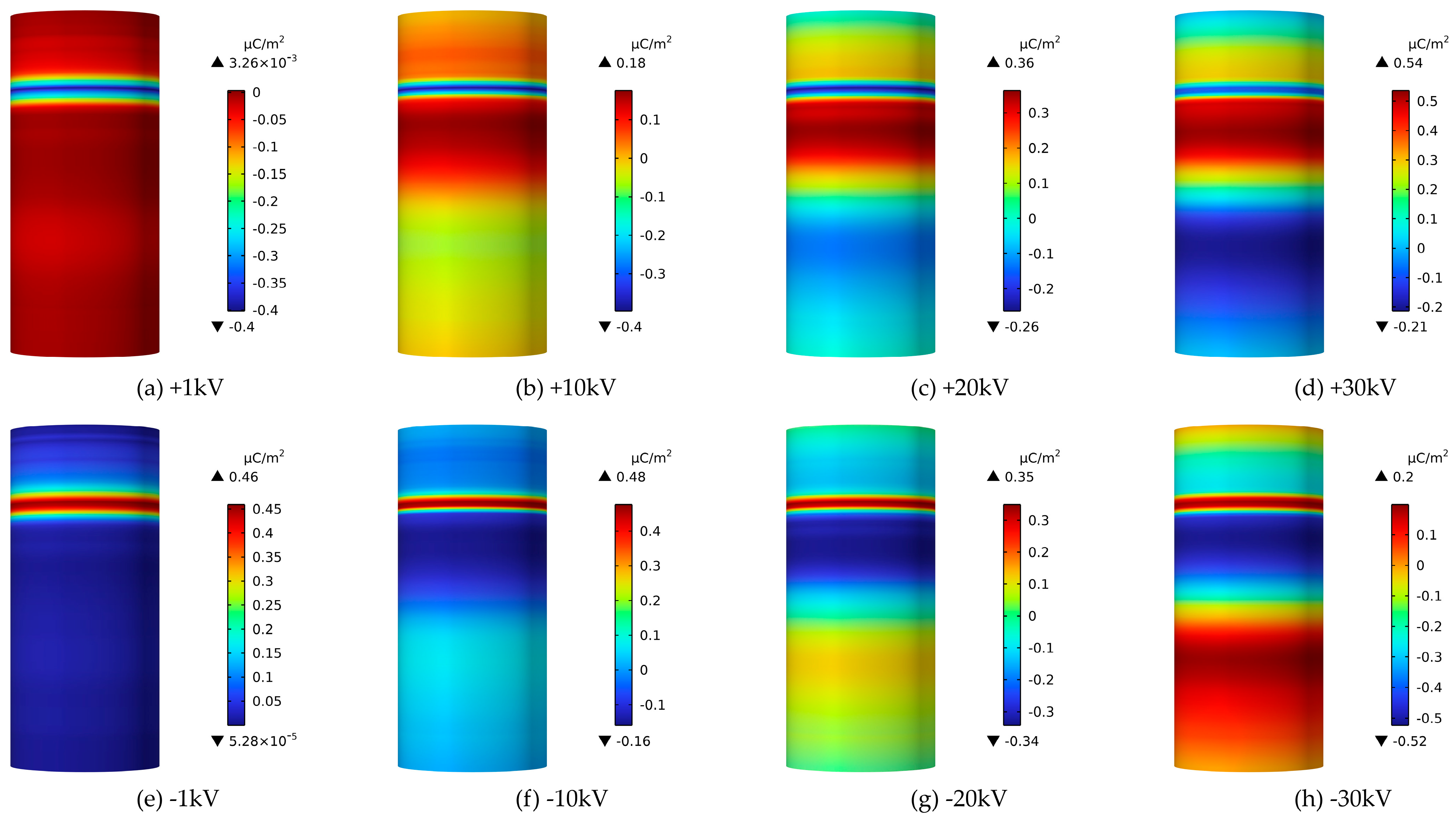 - Lutz, B.; Kindersberger, J. Surface charge accumulation on cylindrical polymeric model insulators in air: Simulation and measurement. IEEE Trans. Dielectr. Electr. Insul. 2011, 18, 2040–2048. [Google Scholar] [CrossRef]