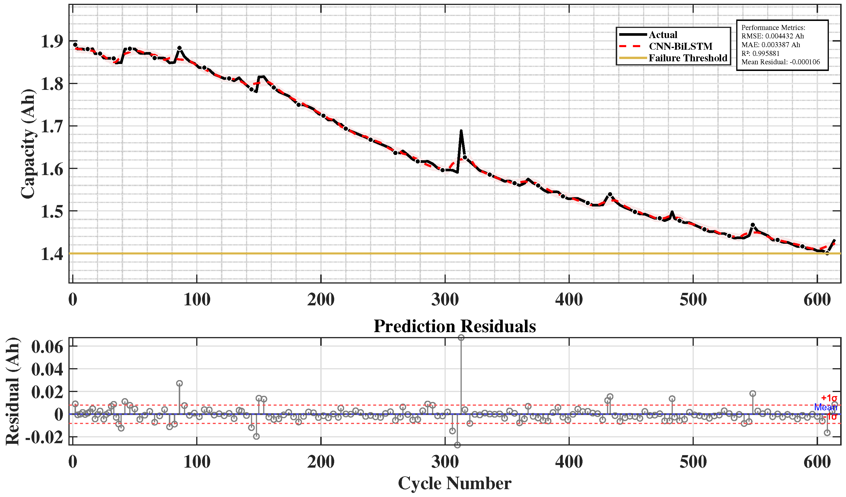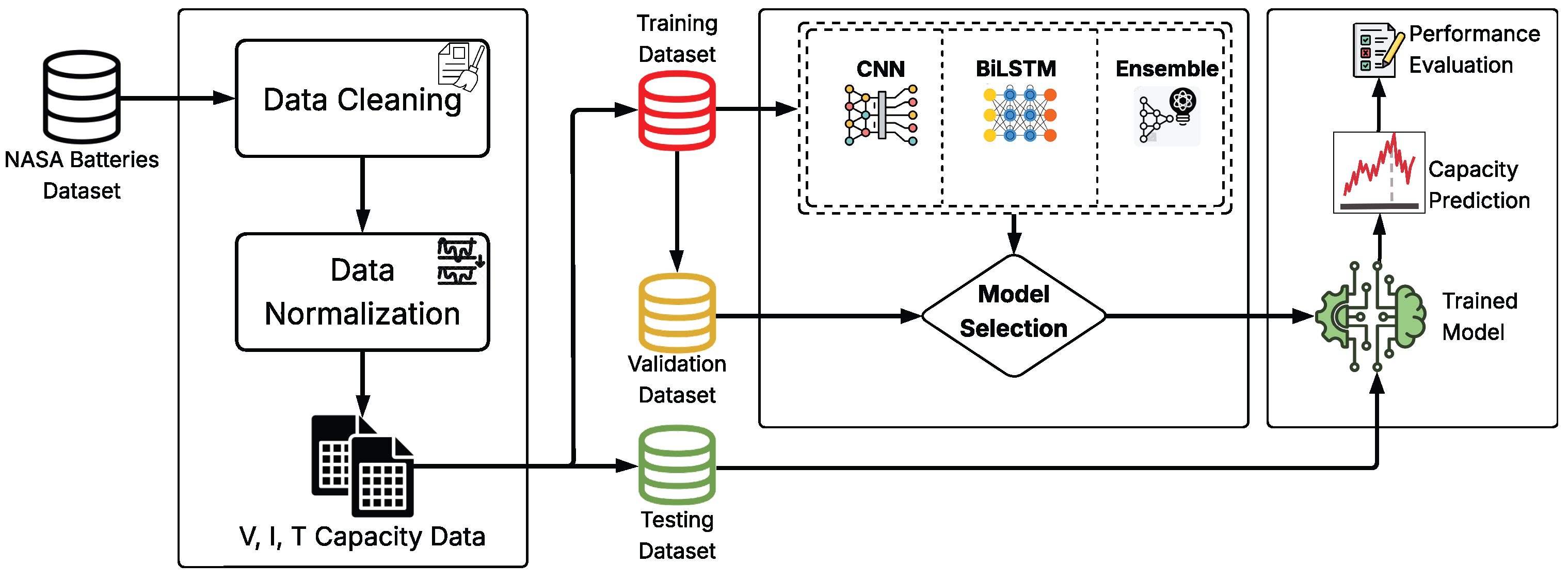 Figure 3 illustrates the workflow of the proposed framework. The pipeline begins with the NASA lithium-ion battery dataset, which is cleaned and normalized first. The processed voltage, current, and temperature signals are then divided into training, validation, and testing subsets. These data are passed through a hybrid DL model consisting of a CNN, a BiLSTM, and an ensemble module, after which model selection takes place. The final stage produces capacity predictions together with a performance evaluation. SoH can then be derived from the predicted capacity as the ratio of predicted to nominal capacity, and RUL can be estimated relative to the 1.40 Ah end-of-life threshold, as explained in later sections. This design captures both localized fluctuations and long-term degradation patterns, ensuring stable performance under irregular cycling conditions.