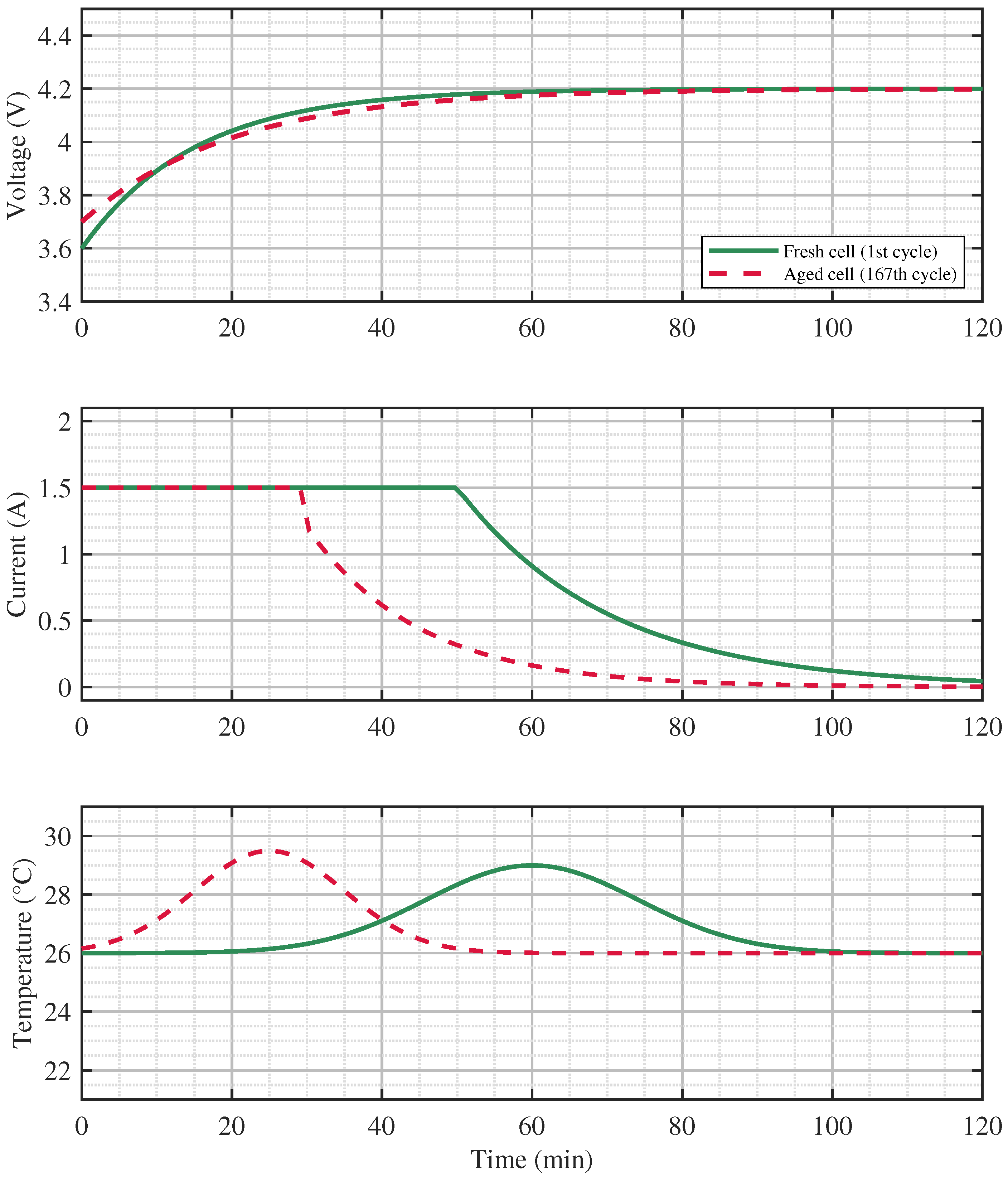 Time-series plots of voltage, current, and temperature for fresh (Cycle 1) and aged (Cycle 168) battery cells.