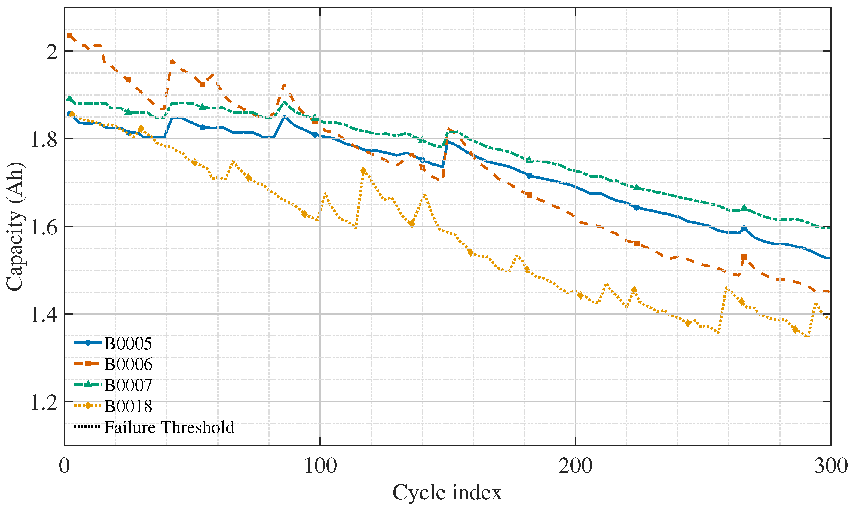 Table 2. Constant current (CC)–constant voltage (CV) charging occurs at 1.5 A to 4.2 V with a cut-off current of 20 mA. Similarly, the following cut-off voltages were obtained: 2.7 V (B0005), 2.5 V (B0006 and B0018) and 2.2 V (B0007). Furthermore, the initial capacity was found to range from 1.86 to 2.04 Ah, with an end-of-life threshold of 1.40 Ah.