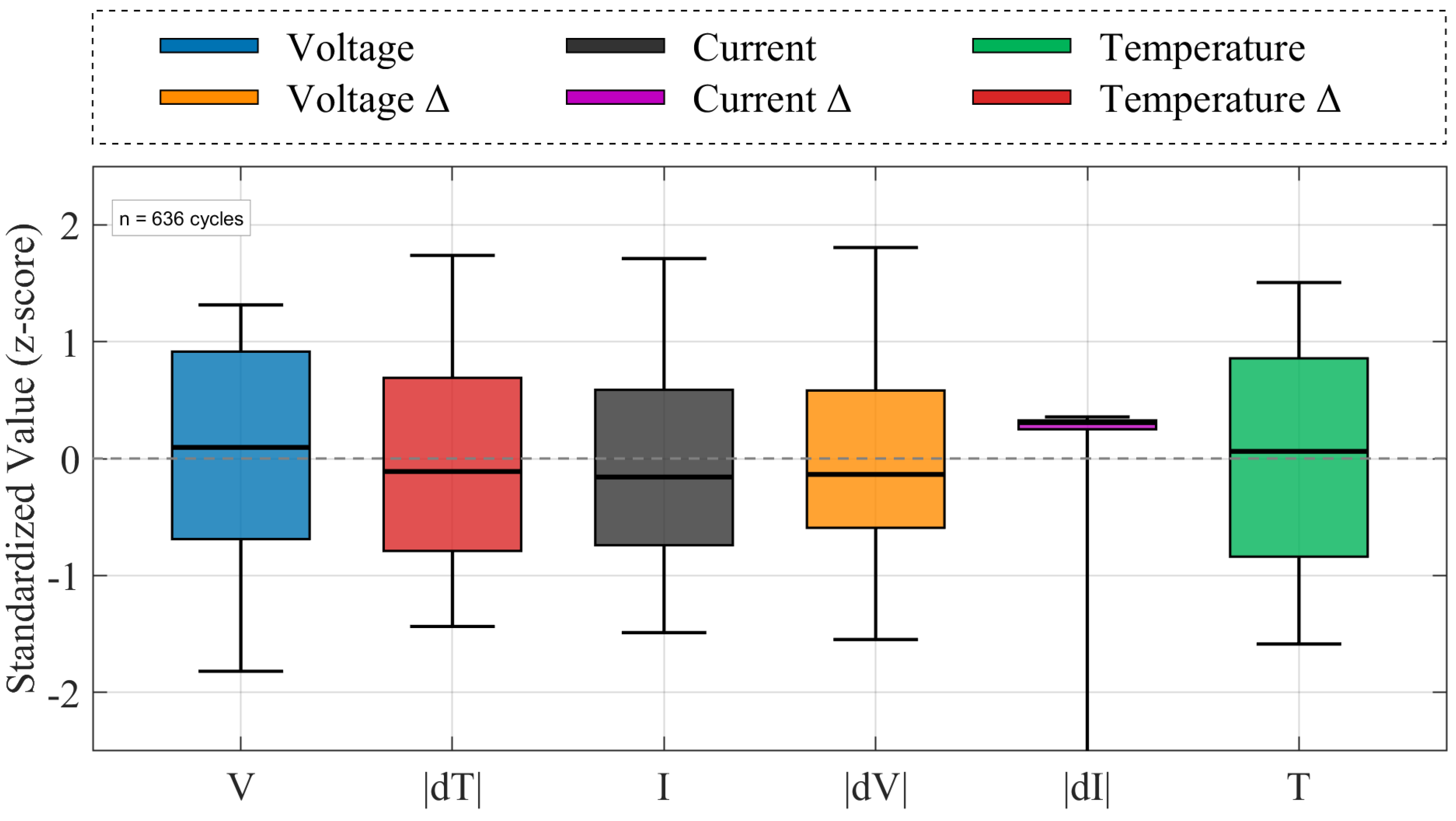 Figure 7 shows the z-score distributions of these features across cycles. Voltage and its derivatives display the highest variability, indicating high sensitivity to degradation, while temperature-related channels provide complementary thermal information.