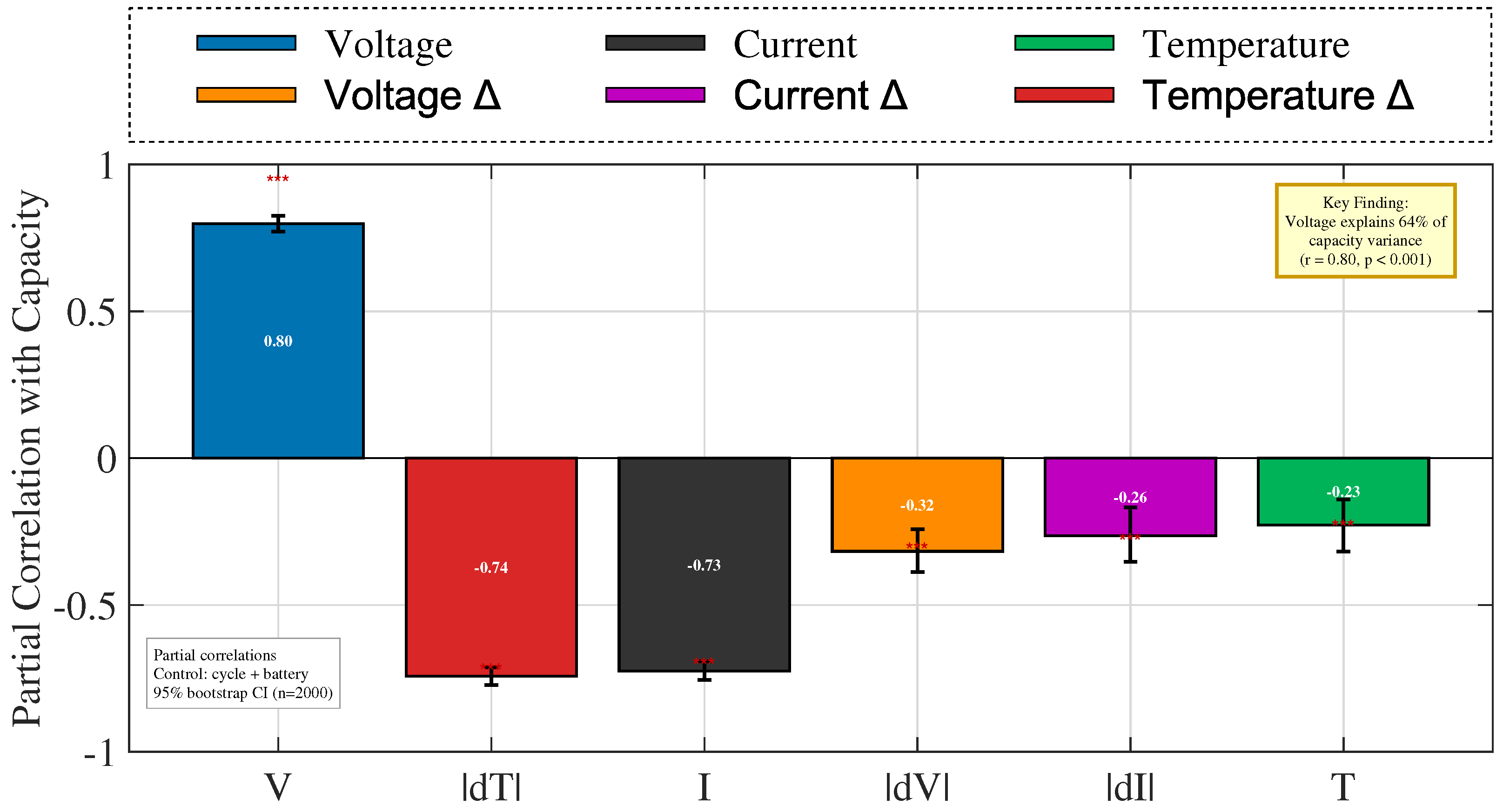 Figure 8 further reports partial correlation coefficients with measured capacity, controlling for cycle index and battery identity.