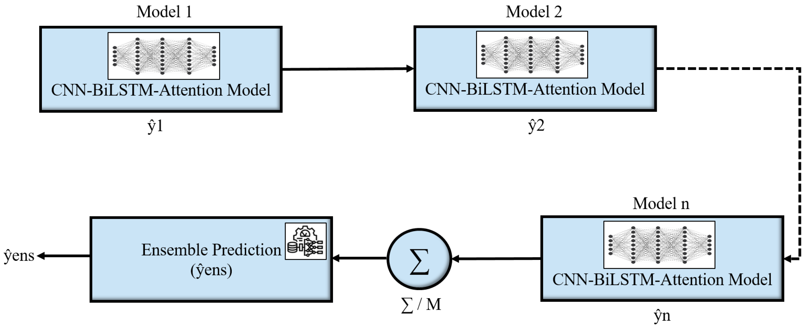 DL models such as CNN-BiLSTM with temporal attention capture degradation dynamics effectively. However, their predictions may still be sensitive to initialization, data splits, or stochastic optimization. To mitigate this variability, the framework incorporates ensemble learning, where multiple base models are trained independently and their outputs are averaged into a consensus prediction. If