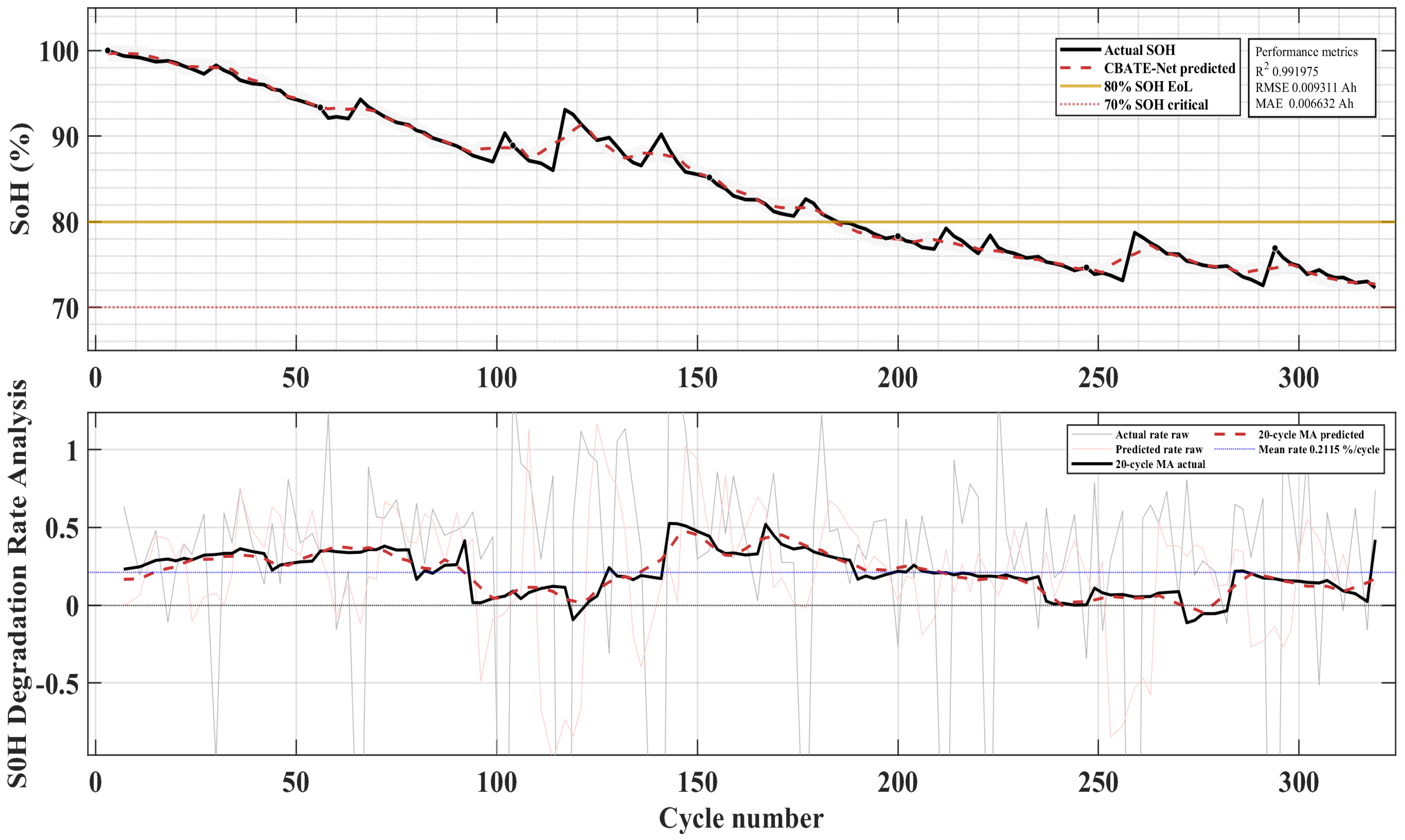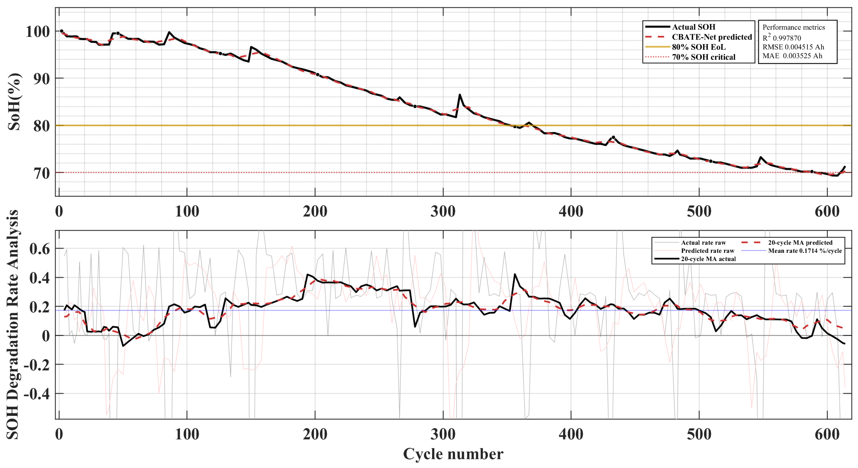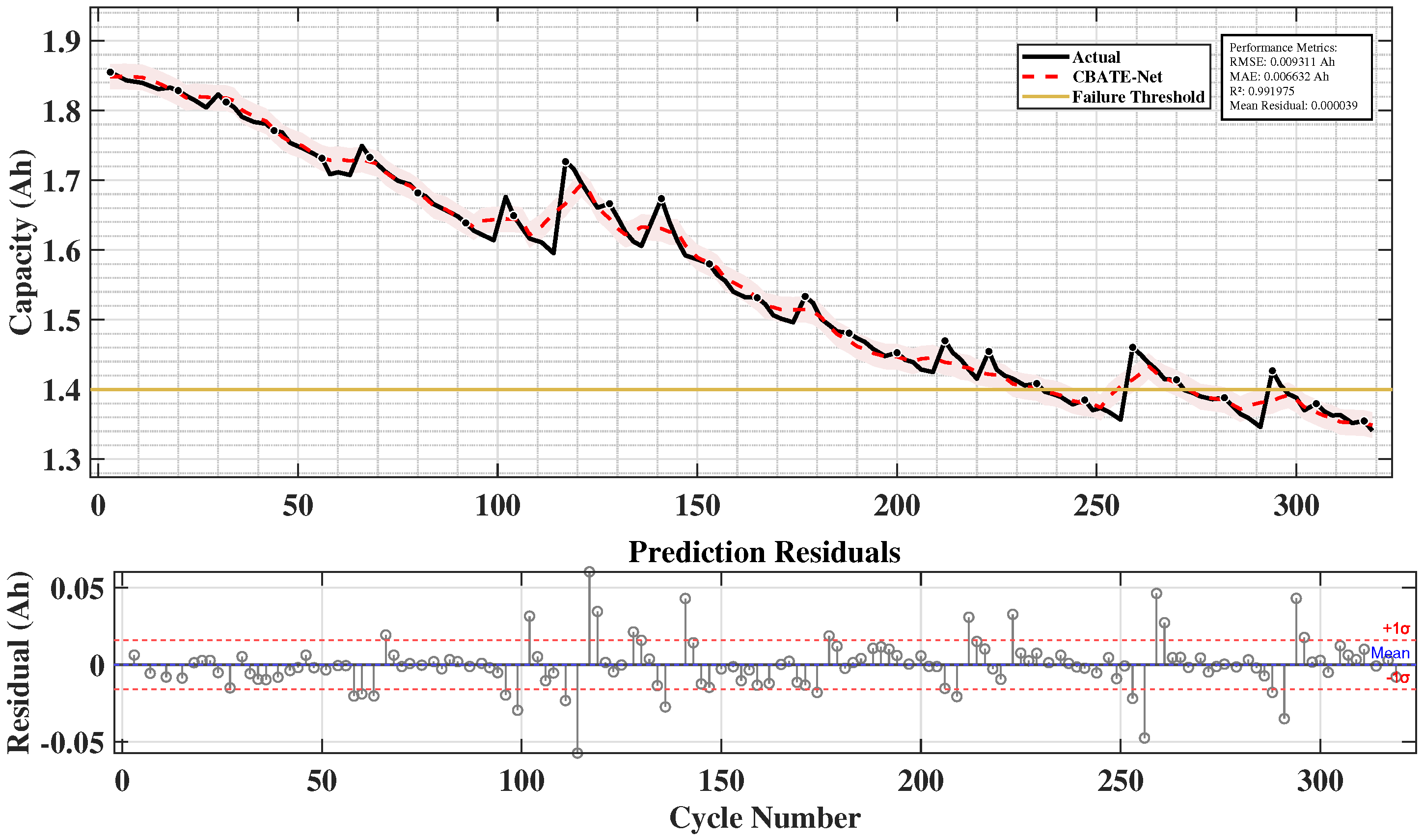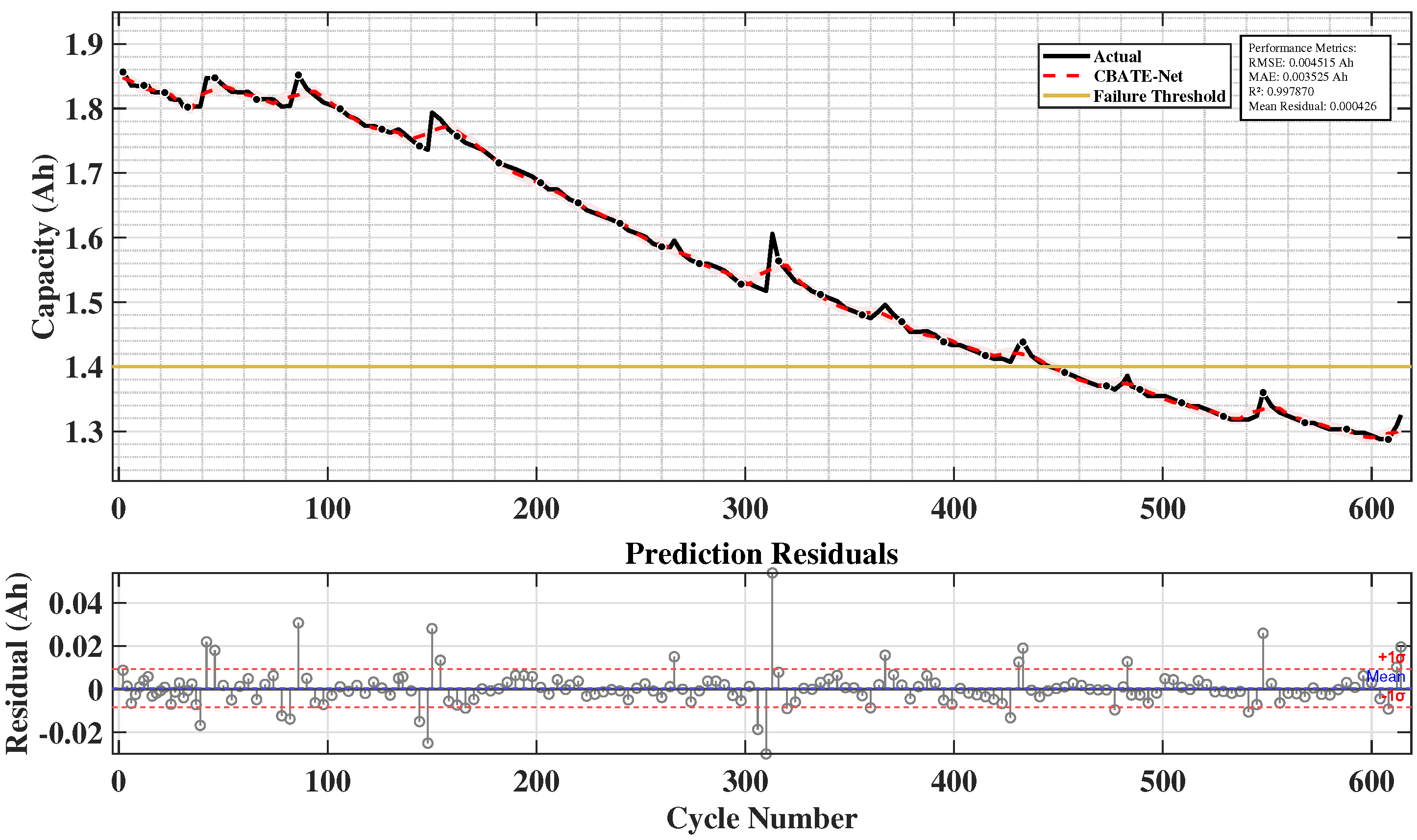 The proposed CBATE-Net framework was trained on the NASA PCoE lithium ion datasets. For each battery, we stratify samples by the target distribution (within that battery) and then assign 70% to training, 15% to validation, 15% to test while enforcing chronology [