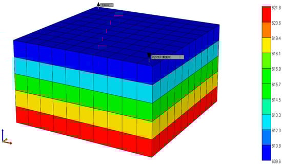 To evaluate in situ hydrogen generation from heavy oil formations, we adapted a full-field reservoir model based on [24] using data from the Marguerite Lake project (BP Resources, 1979). The 3-D grid model (10 × 10 × 5) with 500 active blocks (each 304.8 m × 304.8 m × 15.24 m) involves two injectors and one producer well (Figure 1). One injector handles steam, the other air or gas, and a production well operates under a minimum bottom hole pressure constraint of 137.9 kPa. The physical and chemical characteristics of the modeled reservoir, including porosity, permeability, depth, temperature, and heavy-oil composition, are identical to those described in [25].