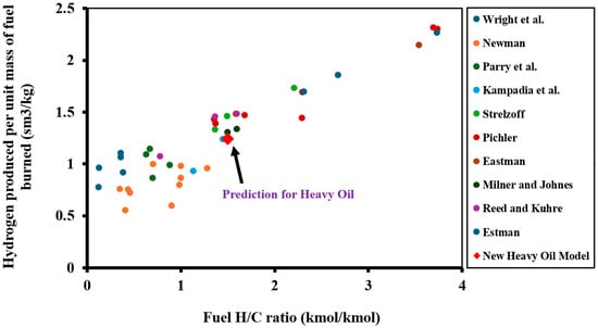 The validation approach involved interpolating the hydrogen yields reported in these studies and comparing them with the expected yield ranges for heavy oil, as shown in Figure 2. Light oils, with H/C ratios typically between 1.8 and 2.1 [40], generally produce hydrogen yields in the range of approximately 1.25 to 1.75 S m3/kg of fuel burned. In contrast, heavy oils, with H/C ratios between 1.3 and 1.7 [40], yield between 1.0 and 1.5 S m3/kg.