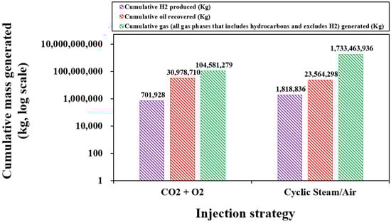 The injection strategy selected for this study includes two main approaches: CO2 + O2 and cyclic steam/air injection. These strategies are based on established methods in the literature for hydrogen production through in situ combustion gasification in heavy oil reservoirs [26,27,28,29]. The CO2 + O2 injection approach enhances gasification reactions by adding CO2 as a reactive component, which can alter the composition and yield of produced gases. Cyclic steam/air injection supports sustained combustion and introduces steam, which promotes further gasification reactions. Each injection strategy is assessed within the model to evaluate its effect on hydrogen production.