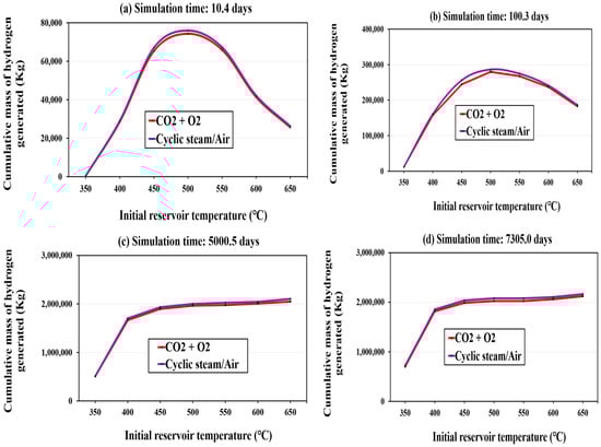 Figure 5. Cumulative hydrogen yield from heavy oil reservoirs at different initial reservoir temperatures over a period of 10.4, 100.3, 5000.5, and 7305.0 days.