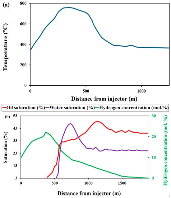 Figure 6. (a) Reservoir temperature distribution profile along the injection production wells. (b) Oil saturation, water saturation, and hydrogen concentration distribution profiles along the injection production wells.