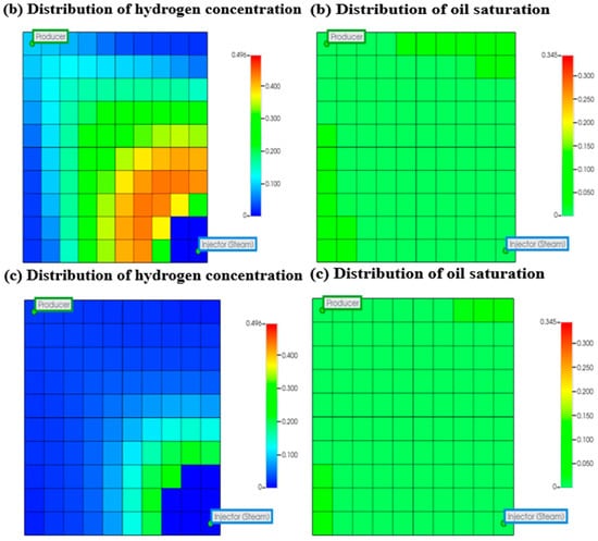 Figure 7. Distribution of hydrogen concentration and oil saturation between the injector and producer at: (a) First production cycle, (b) Second production cycle, (c) Third production cycle.
