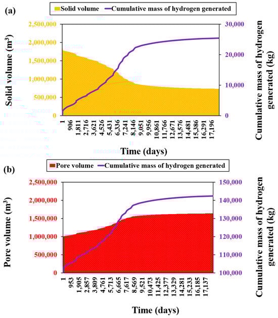 Figure 8. (a) Solid volume vs. Cumulative hydrogen generated, (b) Pore volume vs. Cumulative hydrogen generated.