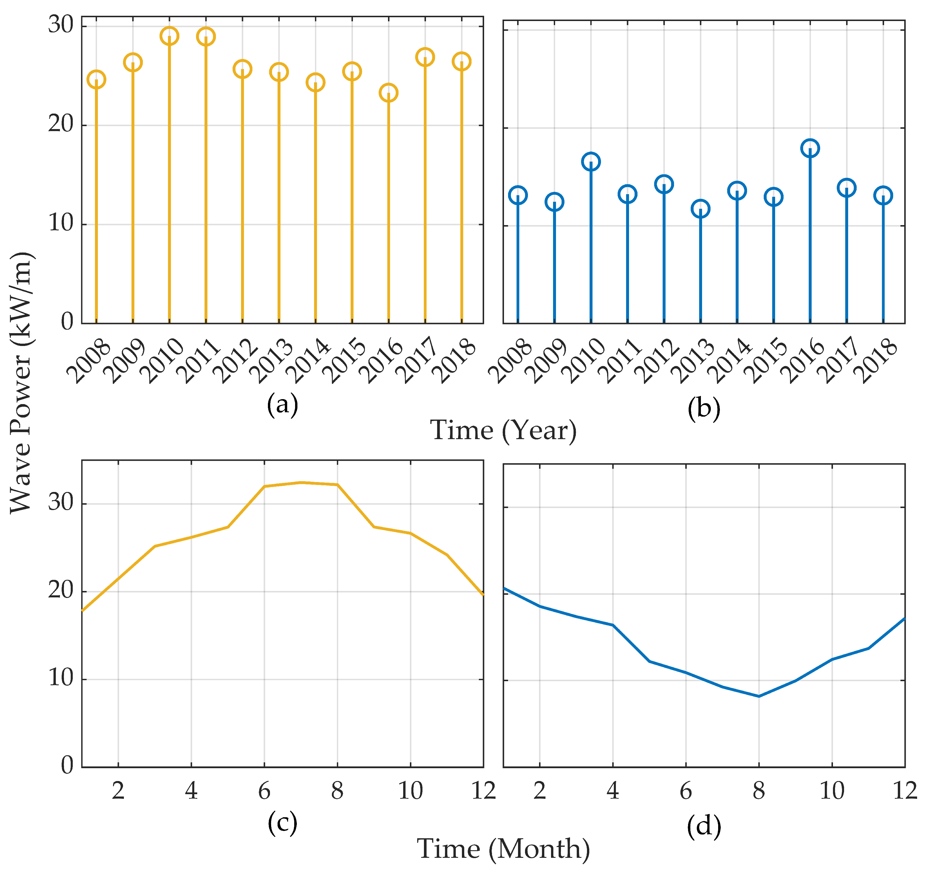 Figure 4. Mean annual and monthly wave power availability at La Serena (a,c) and Ensenada (b,d) over the full hindcast period.