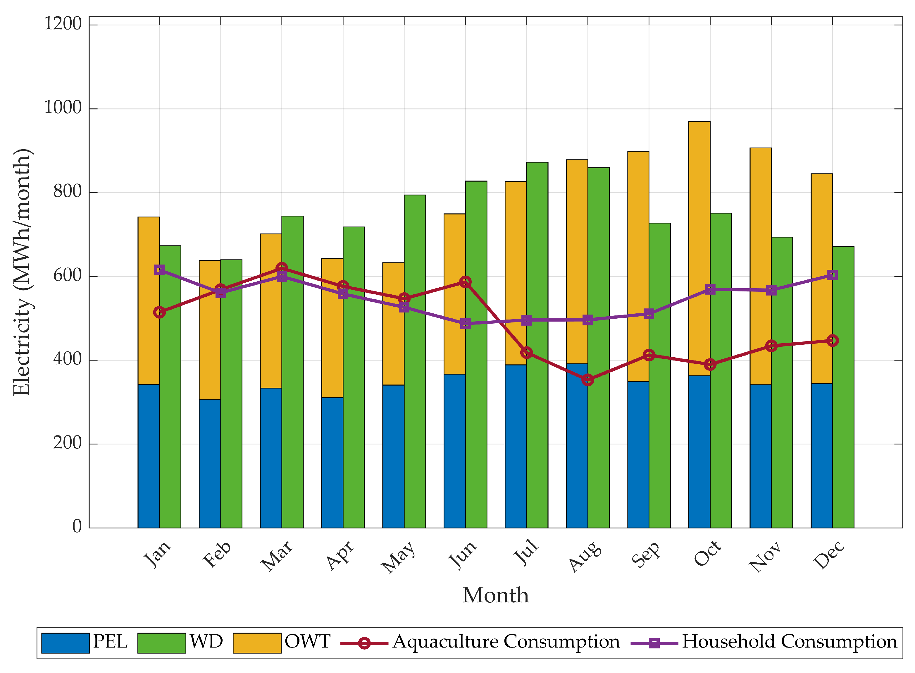 Figure 6. Electricity generation and consumption for La Serena. Blue and yellow bars represent power generation from the PEL-OWT systems and green ones from the WD systems. The red and purple profiles represent the consumption of aquaculture and household, respectively.