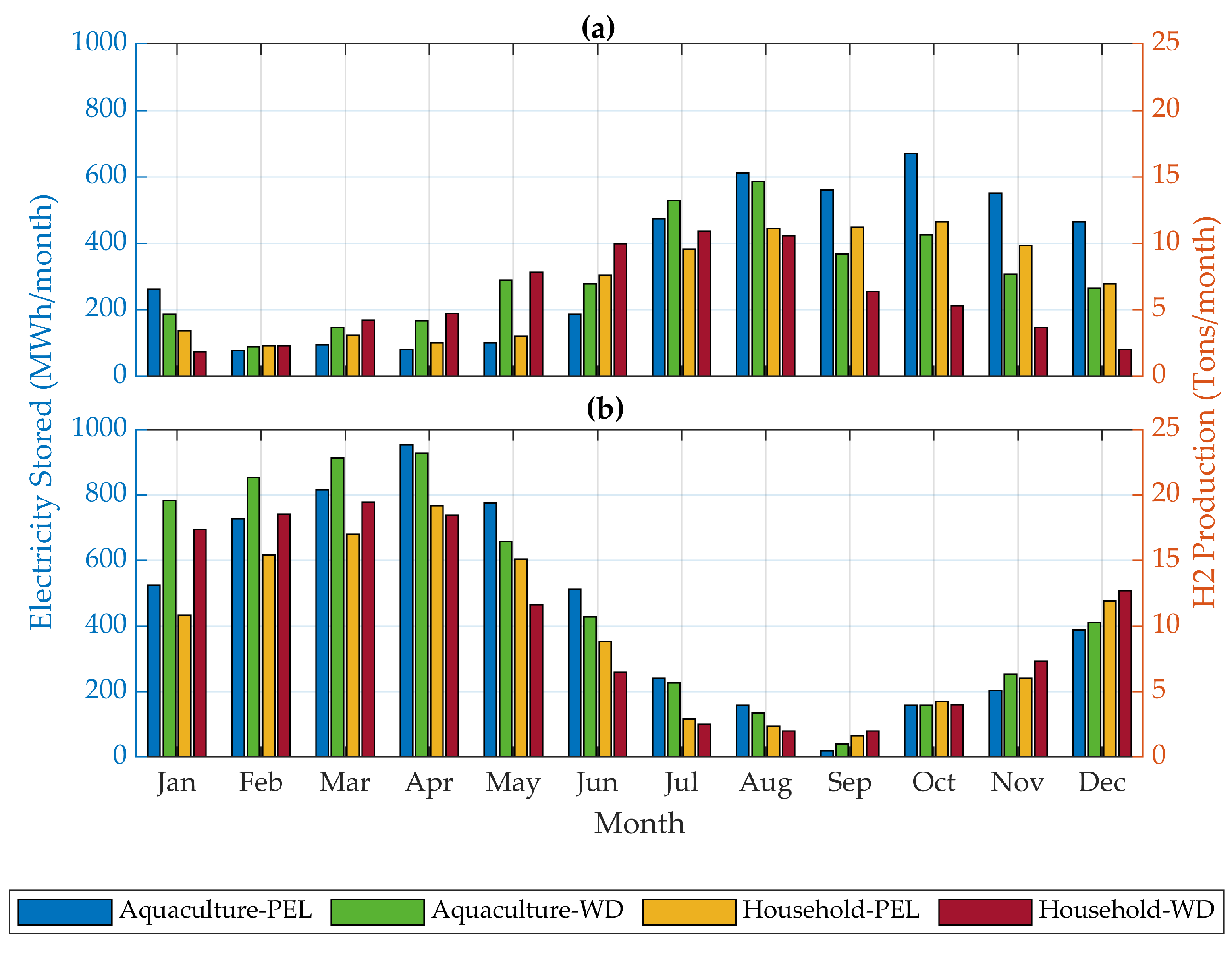 The monthly electricity consumption of households and aquaculture in La Serena and Ensenada (Figure 5) shows that households demand more electricity in summer than in winter. In contrast, for aquaculture, the electricity consumption profiles show that there is more electricity consumption in the autumn, and the lowest is in winter. The average annual electricity consumption of households is also higher than for aquaculture at both sites, while the average monthly variability is higher in aquaculture consumption.