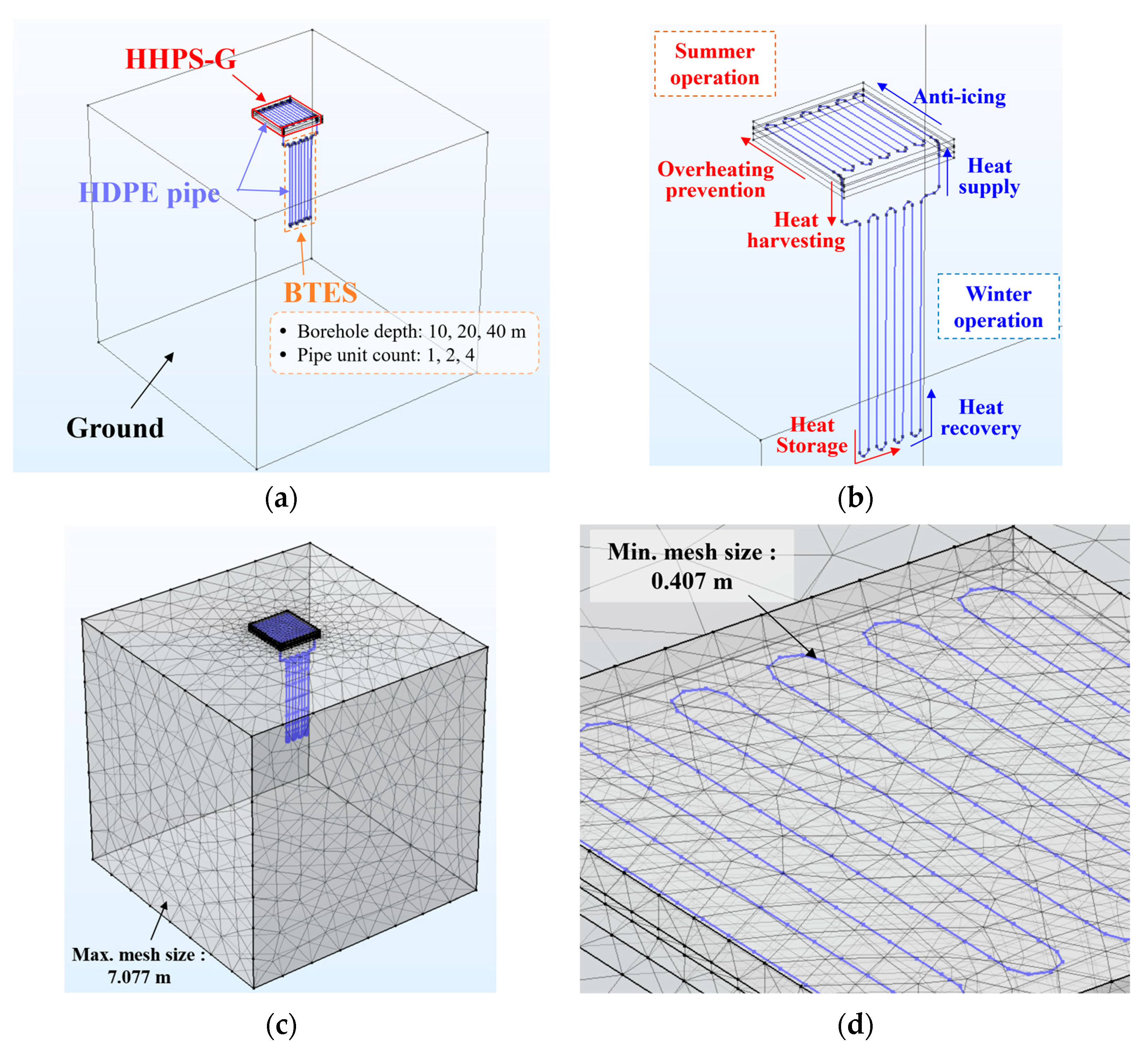 - Using the validated methodology, a coupled HHPS-G–BTES model was developed. Increasing the depth of BTES consistently outperformed simply adding pipe units. Summer pavement cooling improved, and long-term drift diminished, while subsurface overheating was suppressed and total stored heat increased. Adding units at shallow depth yielded diminishing returns due to inter-borehole interference.