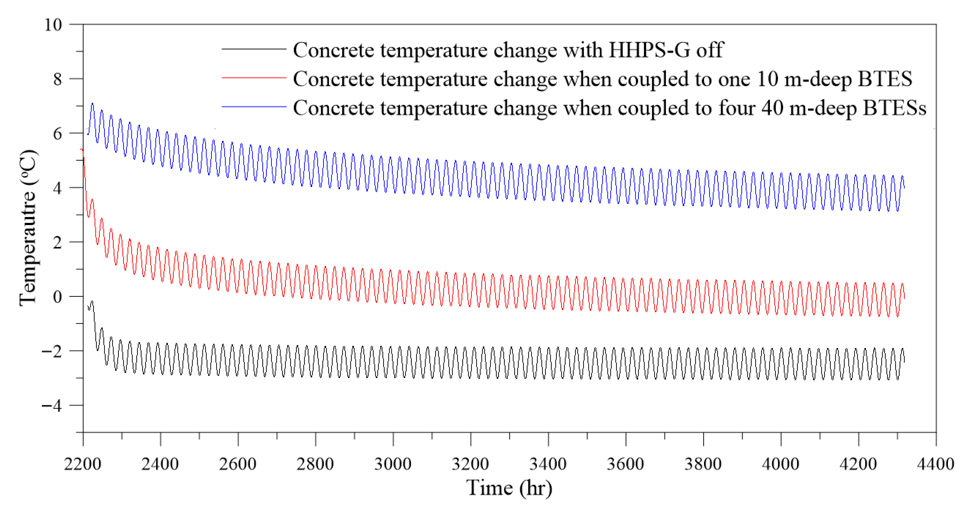 - Model credibility was established through comparisons with prior experiments. The HHPS-G slab-heating replication and the BTES borehole-heating replication showed small errors, supporting the credibility of the component models used in the coupled analysis.