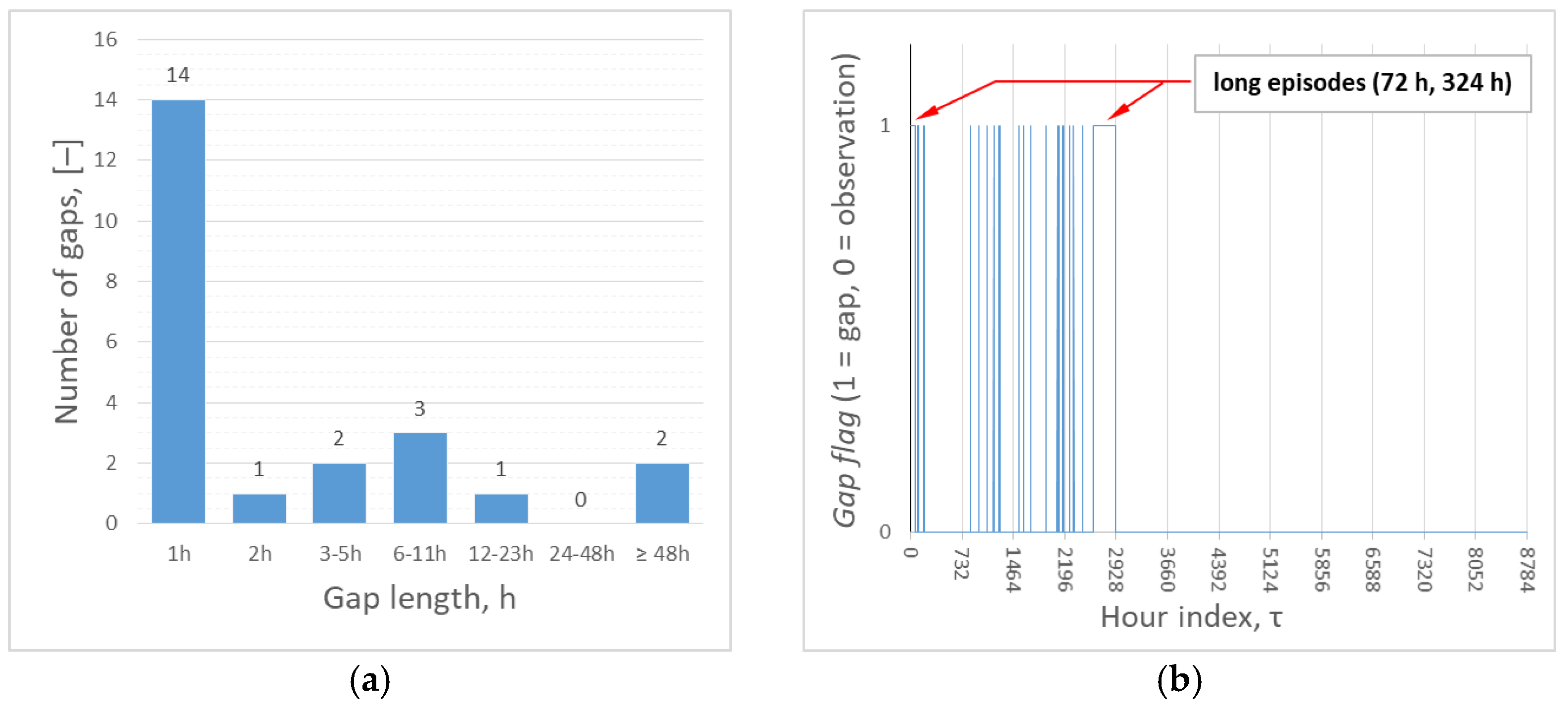 - Cerlini, P.B.; Silvestri, L.; Saraceni, M. Quality Control and Gap-Filling Methods Applied to Hourly Temperature Observations over Central Italy. Meteorol. Appl. 2020, 27, e1913. [Google Scholar] [CrossRef]